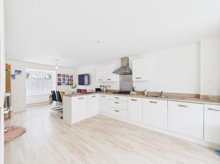 KITCHEN / DINING ROOM A bright and spacious modern kitchen/diner, perfect for family living and entertaining. Features a comprehensive range of overhead, base, and drawer units with roll edged work surfaces, a 1 1/2 bowl stainless steel sink with drainer, integrated eye level electric double oven and grill, four ring gas hob with extractor above, and built in dishwasher and fridge freezer. A deep fitted larder cupboard offers additional storage, while a uPVC double glazed bay window and French doors provide lovely garden views and access to the rear. Ample space is available for an 8 seater dining table and a gas central heated radiator.