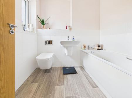 FAMILY BATHROOM A contemporary bathroom suite comprising a panelled bath unit, wall mounted wash hand basin, and low level flush WC. Tiled walls, extractor fan, shaver point, uPVC obscure double glazed window and a white heated towel rail.