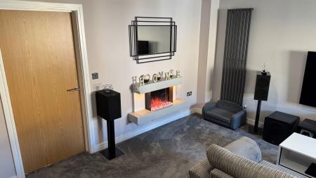 LOUNGE An impressively spacious and light-filled living room situated at the front of the property, offering generous room for various furniture arrangements. Features include an electric fireplace, TV and internet points, built-in ceiling surround sound, stylish overhead spot lighting and two contemporary vertical radiators. Stairs rise to the first floor with a useful under stairs storage cupboard tucked away.