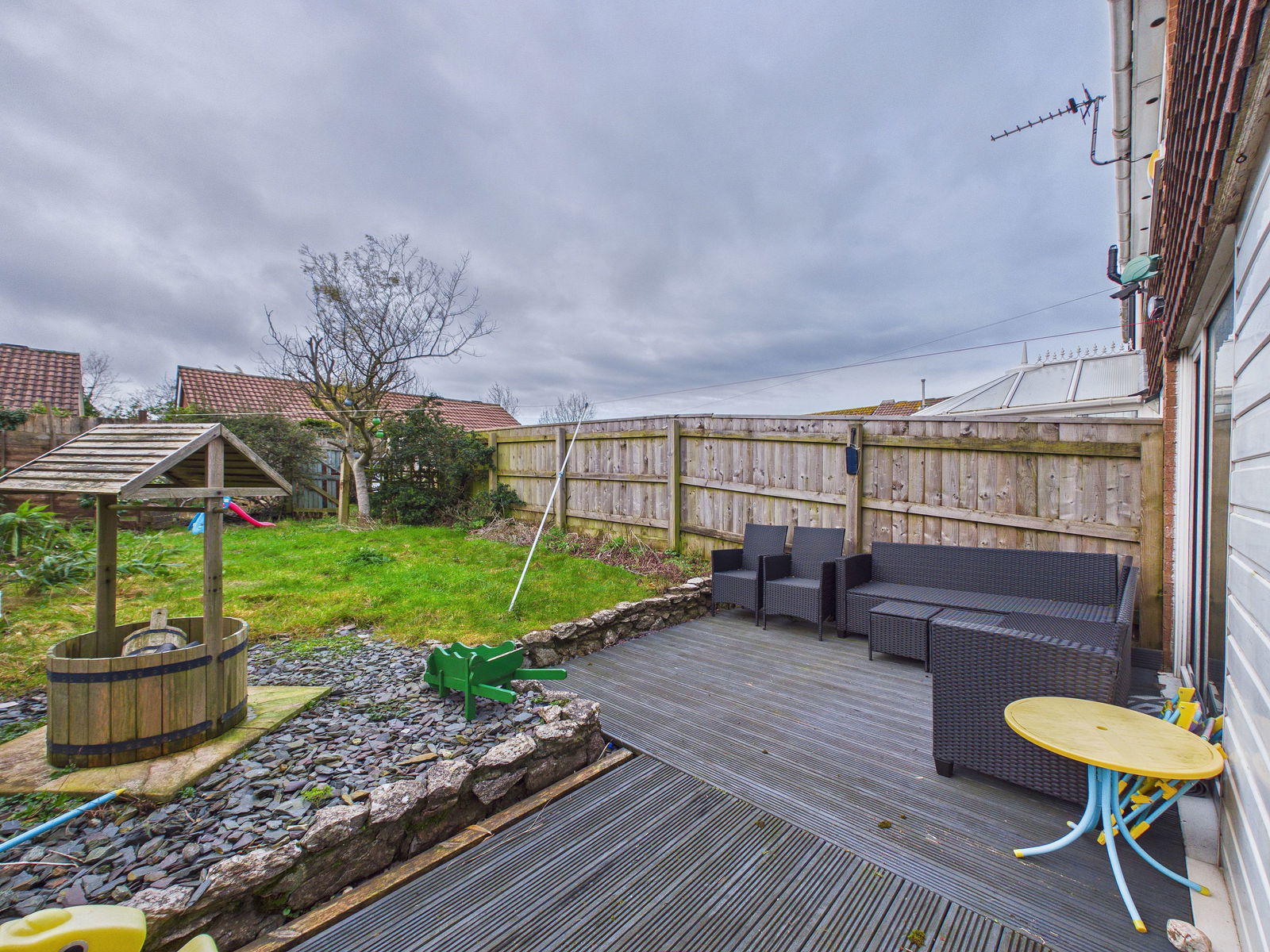 REAR GARDEN A sunny rear garden featuring a decked seating area accessed directly from the kitchen/diner leading to a further lawned section.