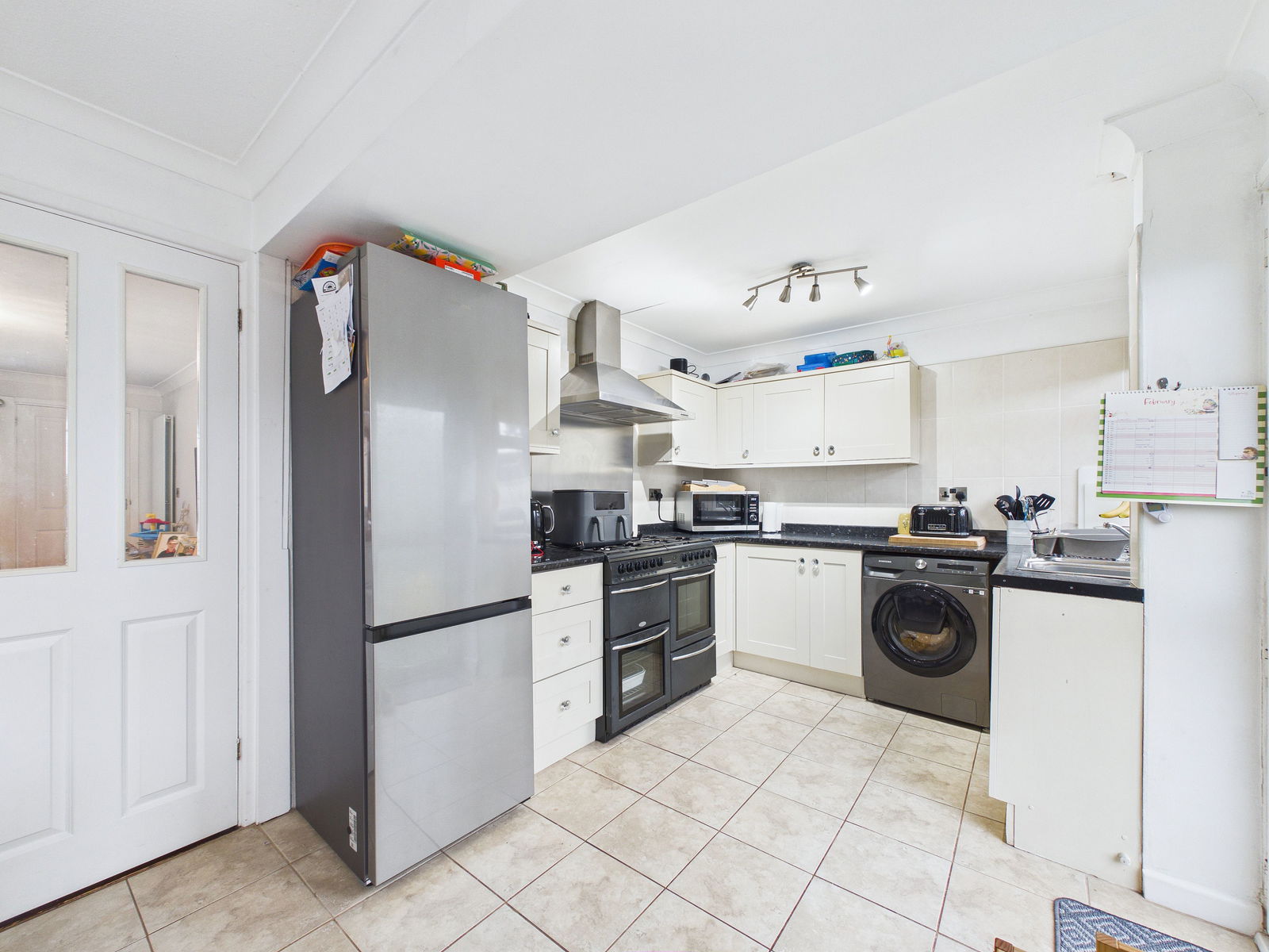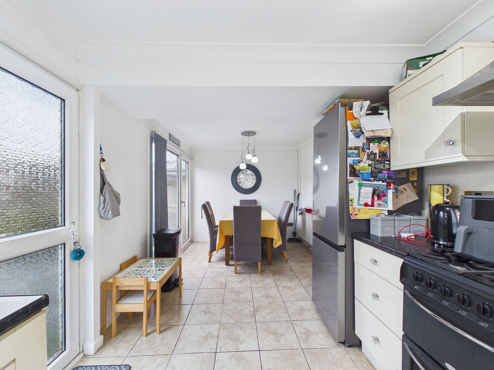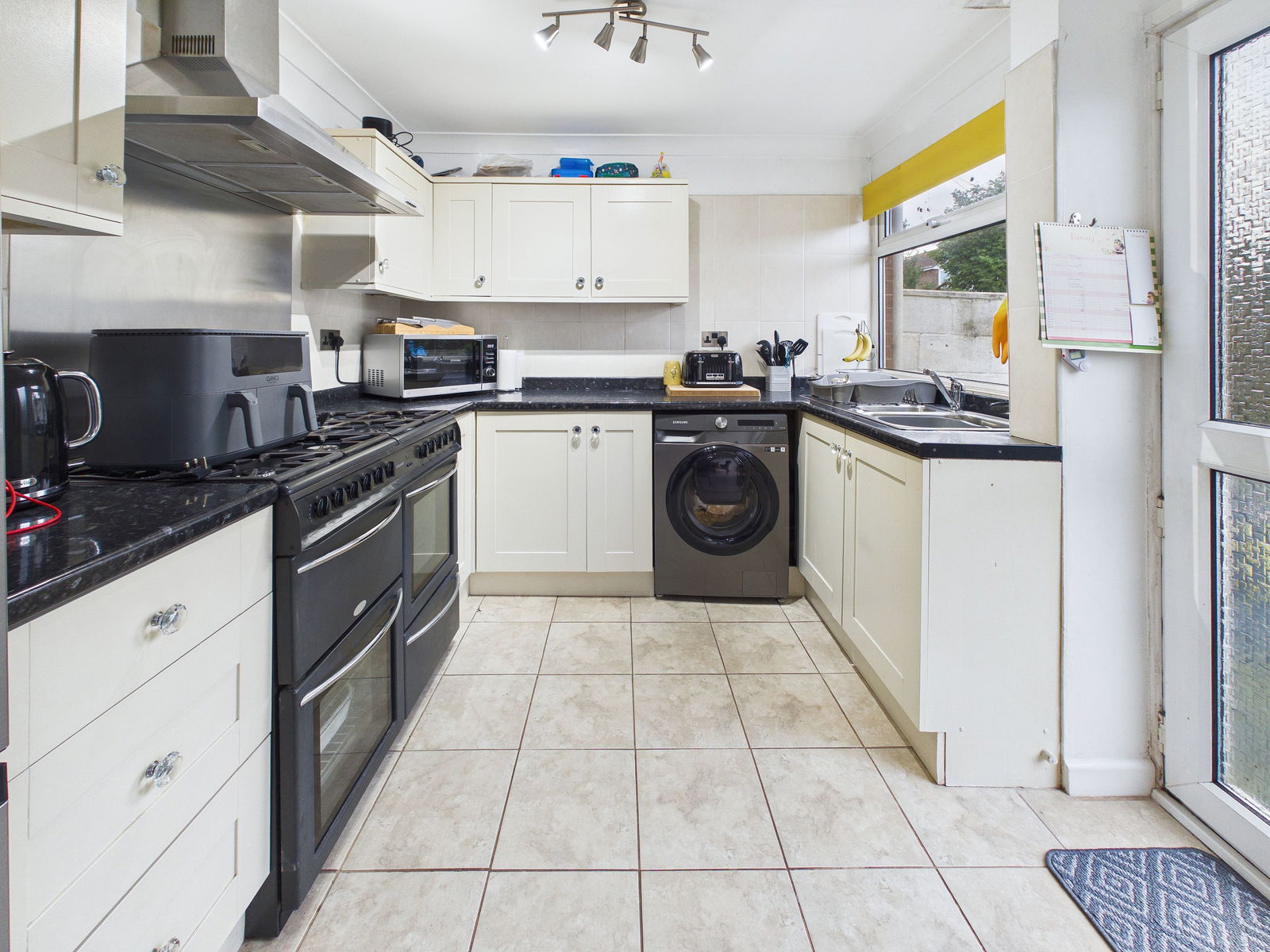 KITCHEN / DINER A spacious and well appointed kitchen boasting a comprehensive range of wall, base and drawer units with roll edge work surfaces. Features include a 1 1/2 bowl stainless steel sink with drainer, range style gas cooker with gas hob and extractor hood above, tiled splash back, and space and plumbing for a washing machine and fridge freezer. There is ample room for a 6 seater dining table. A uPVC double glazed window and two uPVC double glazed doors provide access to the rear garden.