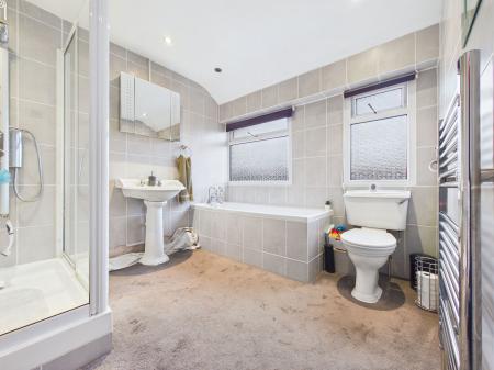 BATHROOM A well proportioned family bathroom comprising a low level WC, pedestal wash hand basin, panelled bath, and a walk in double shower. Fully tiled walls, extractor fan, uPVC obscure double glazed windows, and a chrome heated towel rail complete the space.