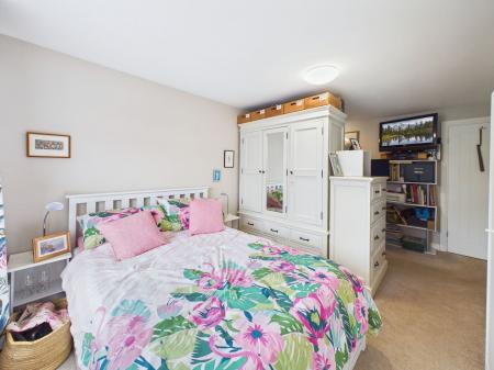 BEDROOM ONE A spacious master bedroom positioned at the front of the property, offering generous proportions and built in wardrobes. Additional features include a uPVC double glazed window and a gas central heating radiator. Currently configured as a Guest Room and Study with a Wardrobe and Drawer Unit positioned as a temporary partition.