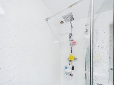 SHOWER ROOM A modern shower room fitted with a low level flush WC, pedestal wash hand basin, and a walk in double shower enclosure. Finished with complementary tiling and PVC wall panels, the room also includes a uPVC obscure double glazed window and a heated white towel rail. Extractor fan and wall mounted electric heater.