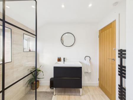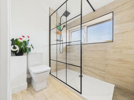 SHOWER ROOM A stylish, modern shower room featuring a low level flush WC, vanity wash basin with storage below, and a walk in shower. Finished with contemporary tiling, a deep airing cupboard housing the combination boiler, uPVC obscure double glazed window, and a black heated towel rail.