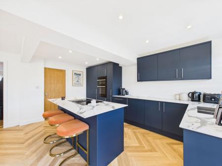 KITCHEN/DINER An exceptionally generous and light filled kitchen/dining space fitted with an extensive range of wall, base and drawer units topped with compact work surfaces. Features include a 1½ bowl stainless steel sink unit, integrated eye level electric double oven with grill, four ring induction hob, integrated dishwasher, fridge freezer, and built in bin storage. The impressive central island offers casual breakfast bar seating, complementing the ample space for an 8 seater dining table. Dual aspect uPVC double glazing including sliding patio doors opening to the garden and an additional door and window. Two gas central heating radiators.