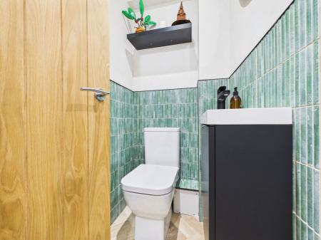 CLOAKROOM A contemporary ground floor cloakroom comprising a low level flush WC, wall mounted wash basin with built in storage, a stylish black heated towel rail and complementary modern tiling.