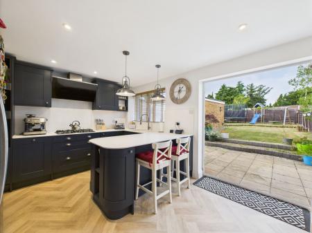 The dining area comfortably accommodates an 8 seater dining table, complete with bespoke built in bench seating and under seat storage. uPVC double glazed bifold doors open onto the garden and a sleek vertical gas central heated radiator.