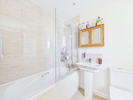 BATHROOM Finished with Karndean flooring and fitted with a bath and shower over, WC, vanity wash basin, radiator, and extractor fan. UPVC double-glazed frosted window.