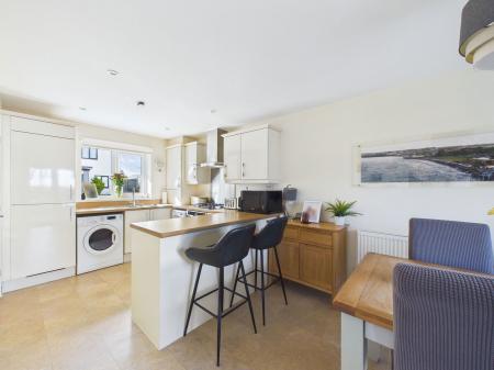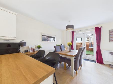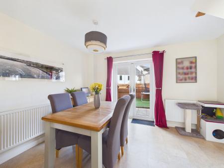 KITCHEN / DINER A large open kitchen and dining space with durable Karndean flooring and ample room for a table and chairs. Features include a breakfast bar, built-in fridge freezer, gas hob, dual electric oven, large sink, and space for a dishwasher and washing machine or dryer. Two radiators provide heating, and double patio doors open onto the rear garden. The combination boiler is also housed here. An understairs cupboard offers additional storage and is large enough to accommodate a tumble dryer.