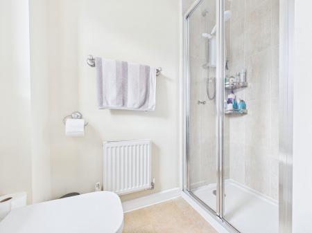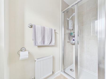 ENSUITE Fitted with Karndean flooring and comprising a WC, vanity wash basin, radiator, and electric walk-in Mira shower. UPVC double-glazed frosted window provides natural light.