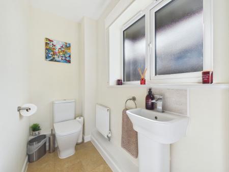 DOWNSTAIRS WC Fitted with Karndean flooring, a vanity wash basin and WC, radiator, and UPVC double-glazed frosted window. The room also houses the electric consumer unit.