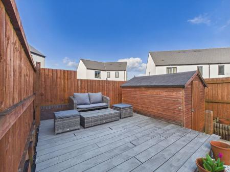 OUTSIDE The rear garden offers a combination of patio space, composite decking, and artificial grass for low-maintenance outdoor living. A shed provides additional storage and benefits from power supply.