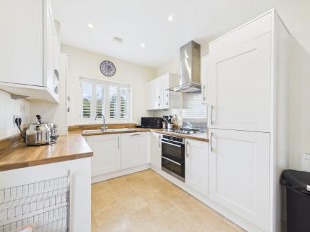 KITCHEN A contemporary fitted kitchen offering a comprehensive range of wall, base and drawer units with roll edge work surfaces. Includes a 1½ bowl stainless steel sink and drainer, electric double oven with grill, four ring gas hob with extractor hood, integrated dishwasher, washing machine and fridge freezer. Housing the Ideal combination boiler, the kitchen also enjoys a uPVC double glazed window overlooking the rear garden and a door providing direct garden access.