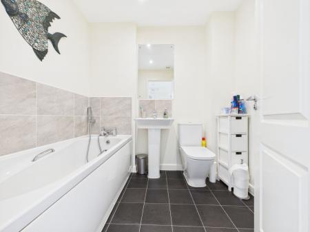 BATHROOM A modern family bathroom fitted with a panelled bath, pedestal wash basin and low level WC. Finished with complementary tiling, extractor fan and chrome heated towel rail.
