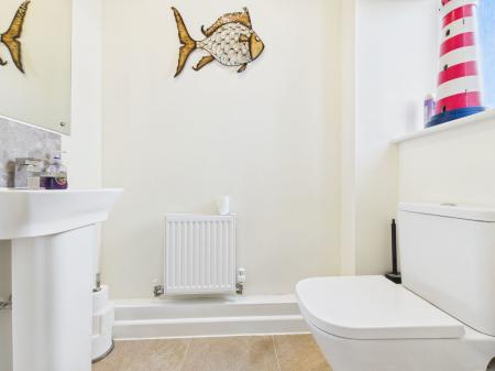 CLOAKROOM A convenient downstairs cloakroom featuring a low level WC, pedestal washbasin, obscure uPVC double glazed window and a central heating radiator.