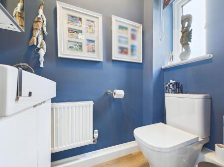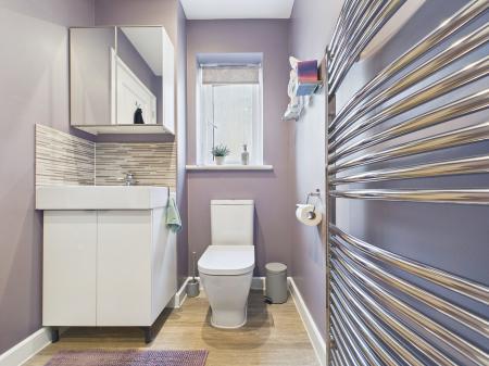 CLOAKROOM A stylish and practical ground floor cloakroom fitted with a low level WC and a vanity wash hand basin with useful storage beneath and tiled splashback. Additional features include a mirrored cabinet, obscure uPVC double glazed window and central heating radiator.