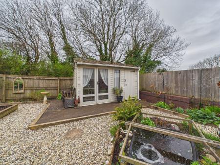 REAR GARDEN A delightful south-west facing rear garden designed with low maintenance in mind. A generous patio area provides the perfect setting for outdoor dining and entertaining, while the remainder of the garden is laid with decorative stones for ease of upkeep. The garden is bordered by planted beds with a variety of shrubs and plants and also features a pond. A substantial summer house/garden office with power, double glazed windows and French doors provides an excellent additional outdoor workspace or relaxation area.