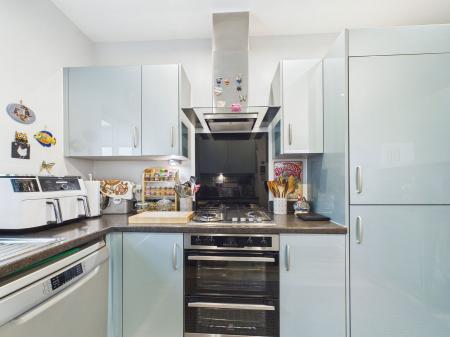 KITCHEN A contemporary fitted kitchen comprising a range of gloss wall, base and drawer units complemented by roll edge work surfaces. Appliances include a 1½ bowl stainless steel sink with drainer, electric double oven with grill, four ring gas hob with extractor above and an integrated fridge freezer. There is space and plumbing for both a dishwasher and washing machine, along with a cupboard housing the Ideal combination boiler. A uPVC double glazed window overlooks the garden room and a door provides direct access to the side of the property.