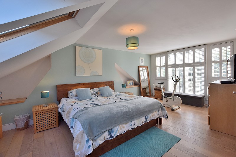 BEDROOM 4: Loft Room. Hardwood flooring. built in wardrobes and drawers Double glazed French doors leading to Juliet balcony. Two double glazed windows to rear aspect. 2 Velux windows to front aspect. Two Radiators.