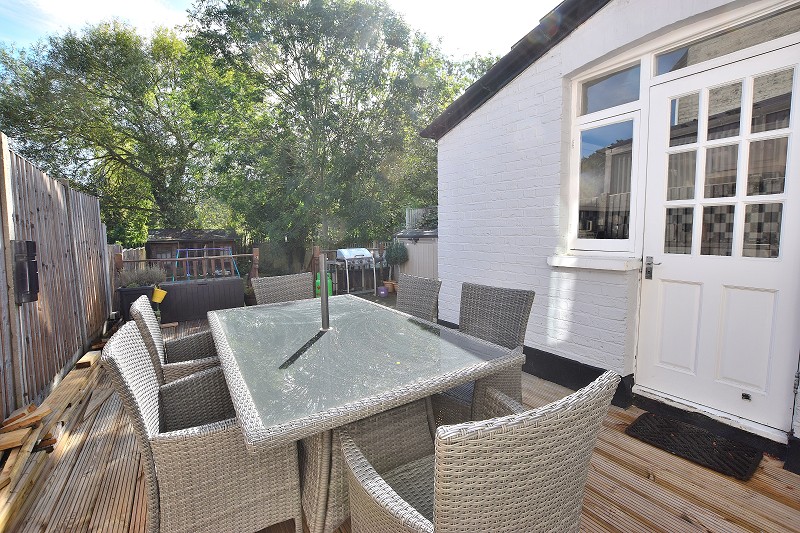 REAR GARDEN: Decking area. Steps down to lawn area. Timber Shed. Cupboard housing combi boiler (Untested)
