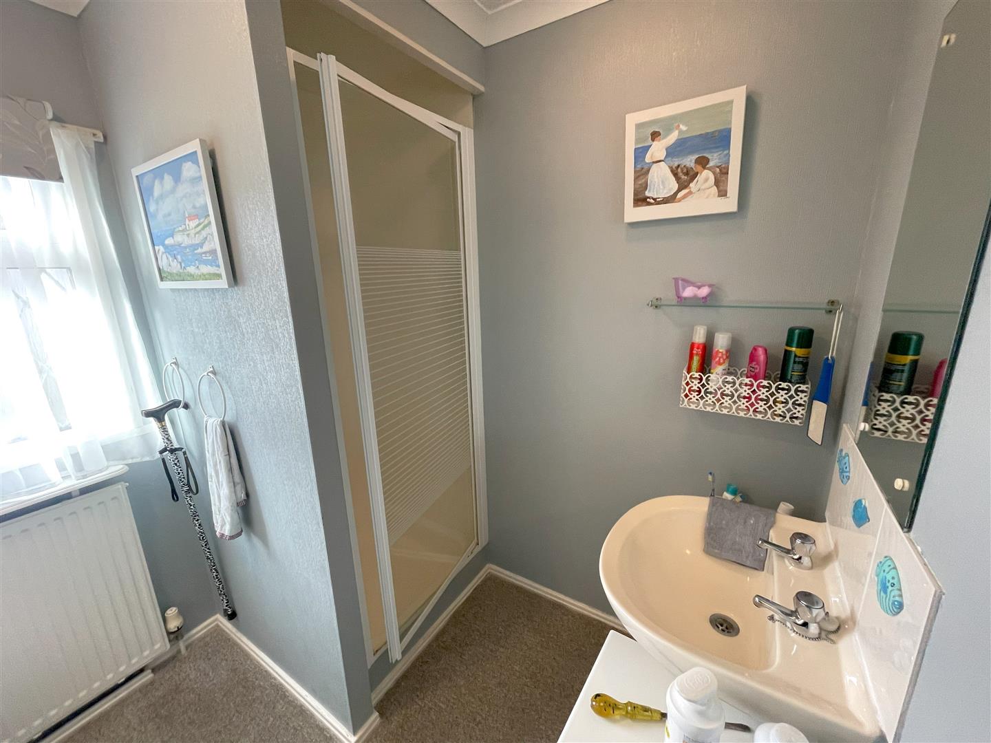 The shower room comprises shower cubicle, wc and wash hand basin.