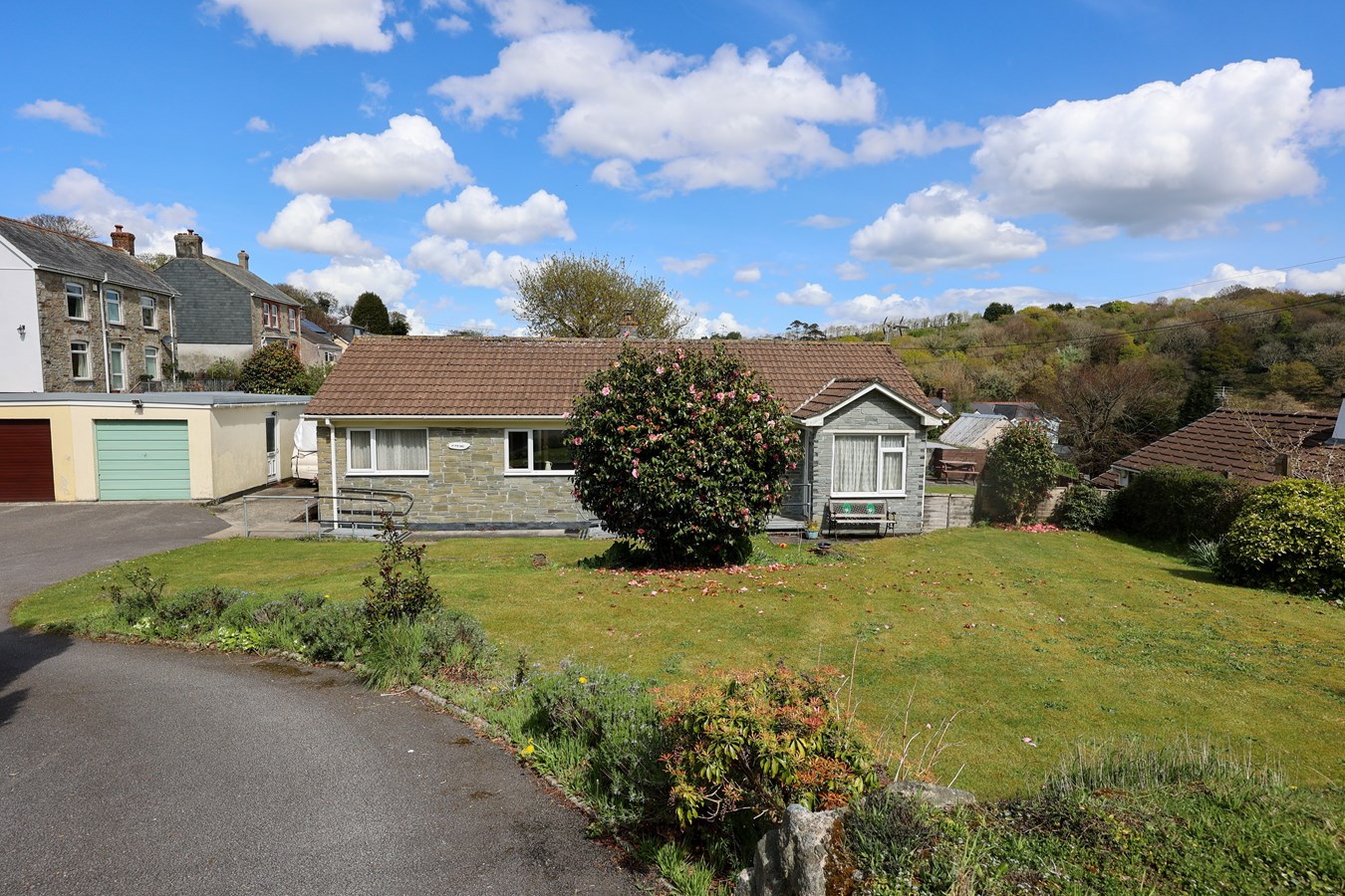 To the front of the property, there is a small gated entrance leading to a slate parking space surrounded by mature borders along the road. Access to the right-hand side is via a concrete pathway. The garden extends around from the front to the side, situated on a mature level corner plot, with additional gates providing access to Tehidy Road. This side access could potentially be converted for vehicular use, subject to obtaining planning consent.