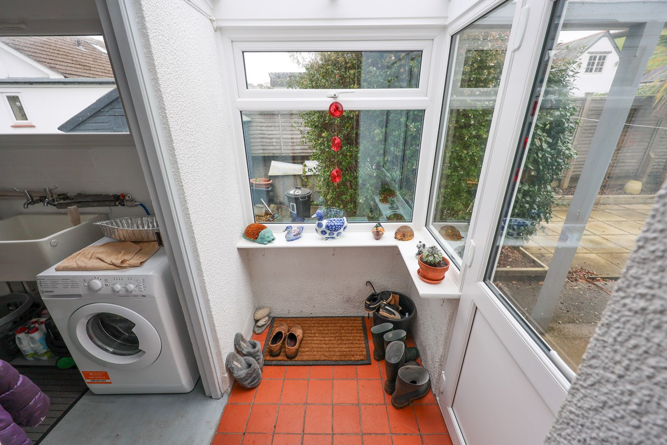 A welcoming space featuring a half-glazed panelled door and a tiled floor, leading to the entrance hall through a part-glazed door. Thoughtfully designed with a small hat and coat cupboard, central heating control, and a radiator for added warmth. There is also easy access to the roof void, providing additional storage potential.