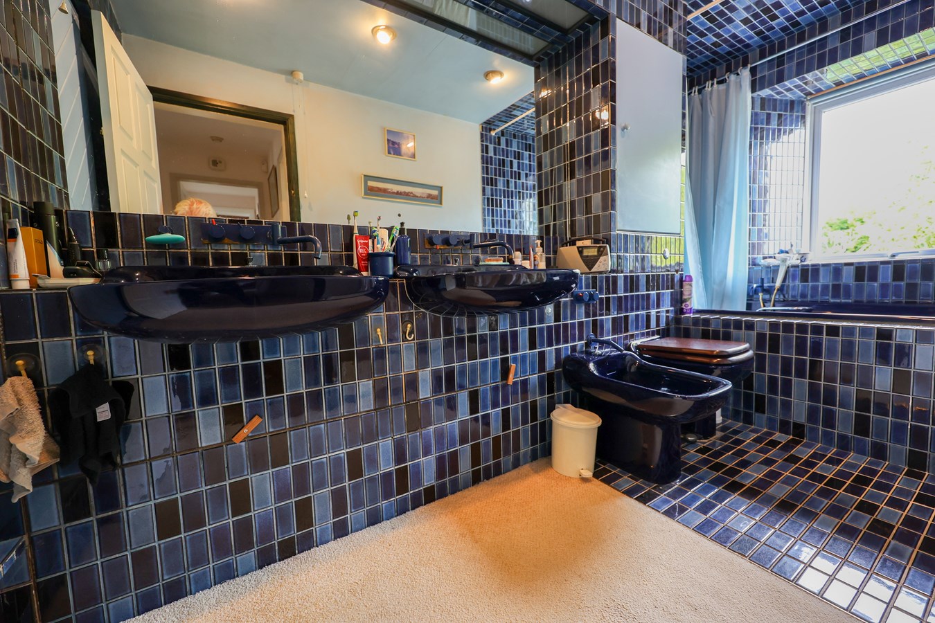 3.5m x 1.59m (11' 6" x 5' 3") The bathroom features twin bowl sink units, a tiled panel bath with shower attachment, a bidet, a concealed cistern low-level WC, and a rear-facing window. Adjacent is a large airing cupboard housing the hot water cylinder and shelving?perfect for linen storage and everyday convenience.