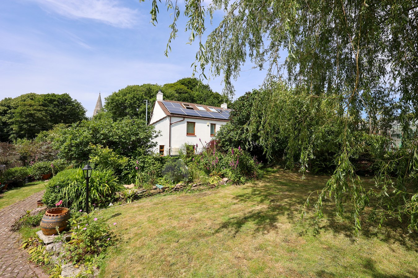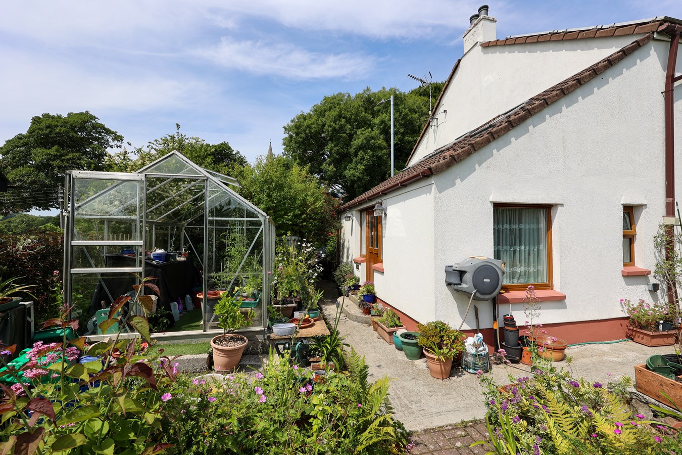 A small gate at the front leads to the side of the property, opening into a beautifully enclosed garden. This outdoor space features a sunny patio, a vegetable patch, and several lawned areas interspersed with mature trees and shrubs?offering both charm and privacy. To the rear, a footpath provides easy access to the garage and parking area.