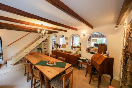 3.57m x 5.4m (11' 9" x 17' 9") An inviting dining space featuring open-tread stairs to the first floor and a charming natural stone fireplace with brick lintel and raised slate hearth. A leaded light display window enhances a built-in storage/display cabinet, while six wall lights create a warm ambience. Light pours in through side and front-facing windows, and an open archway leads seamlessly into the kitchen.