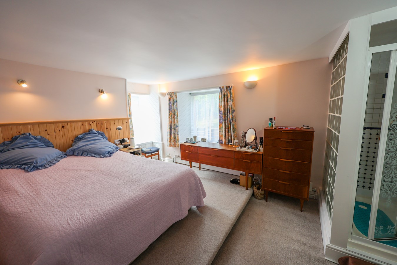 4.4m x 3.55m (14' 5" x 11' 8") This spacious bedroom includes four wall lights, a step up to a raised section, and dual-aspect windows to the side and front. It also features a fitted wardrobe and a fully tiled shower enclosure with a mains shower and striking glass block wall.