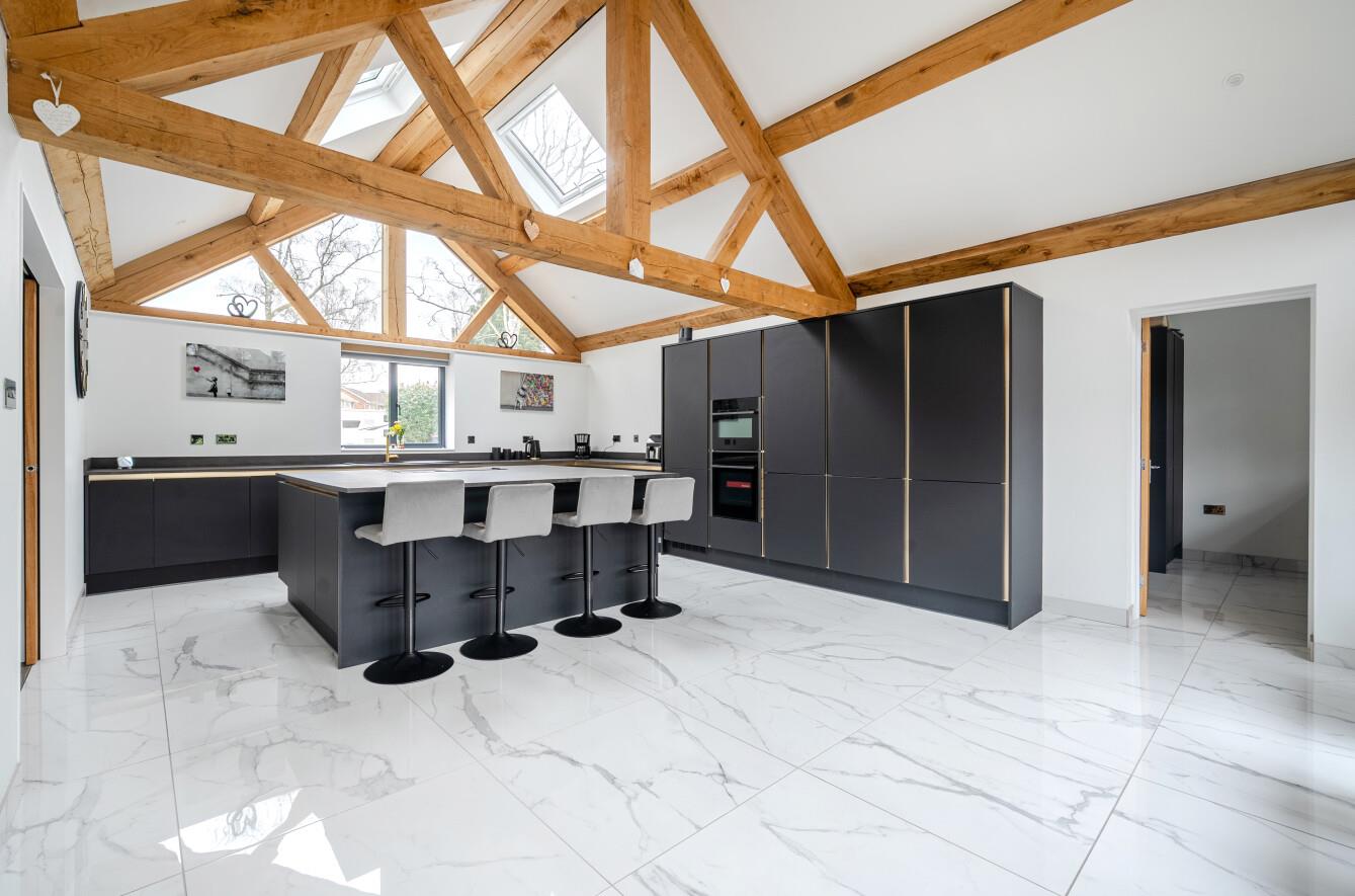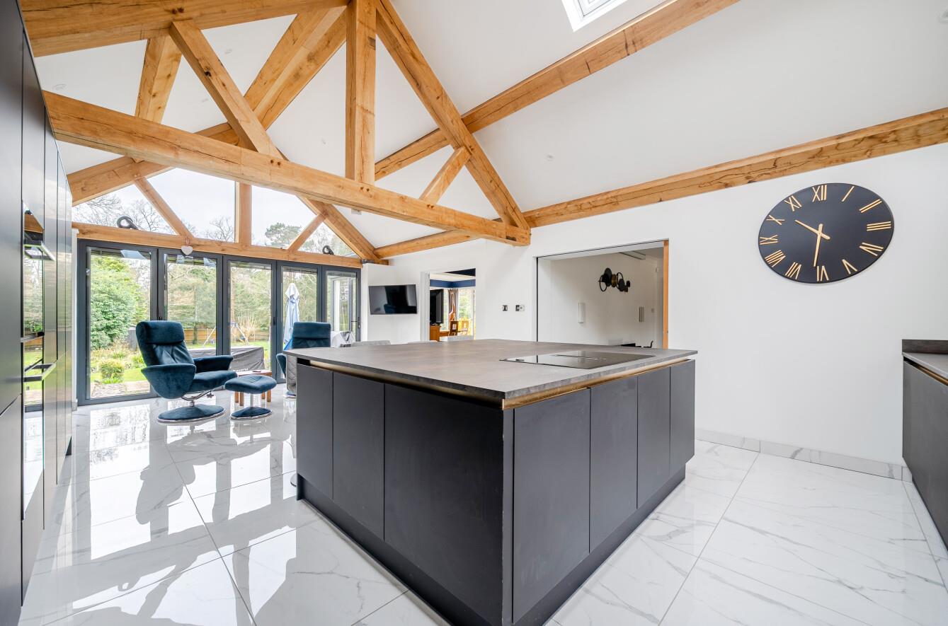 Kitchen/Breakfast/Family Room: - 24'3" x 15'7" (7.38m x 4.76m) A superb addition to the property with an impressive vaulted ceiling with wooden beams and comprising two built-in ovens, induction hob with integrated extractor hood, integrated dishwasher, integrated fridge freezer, integrated freezer, central island incorporating breakfast bar, space for further seating, tiled floor, underfloor heating.