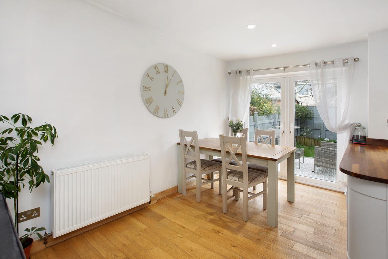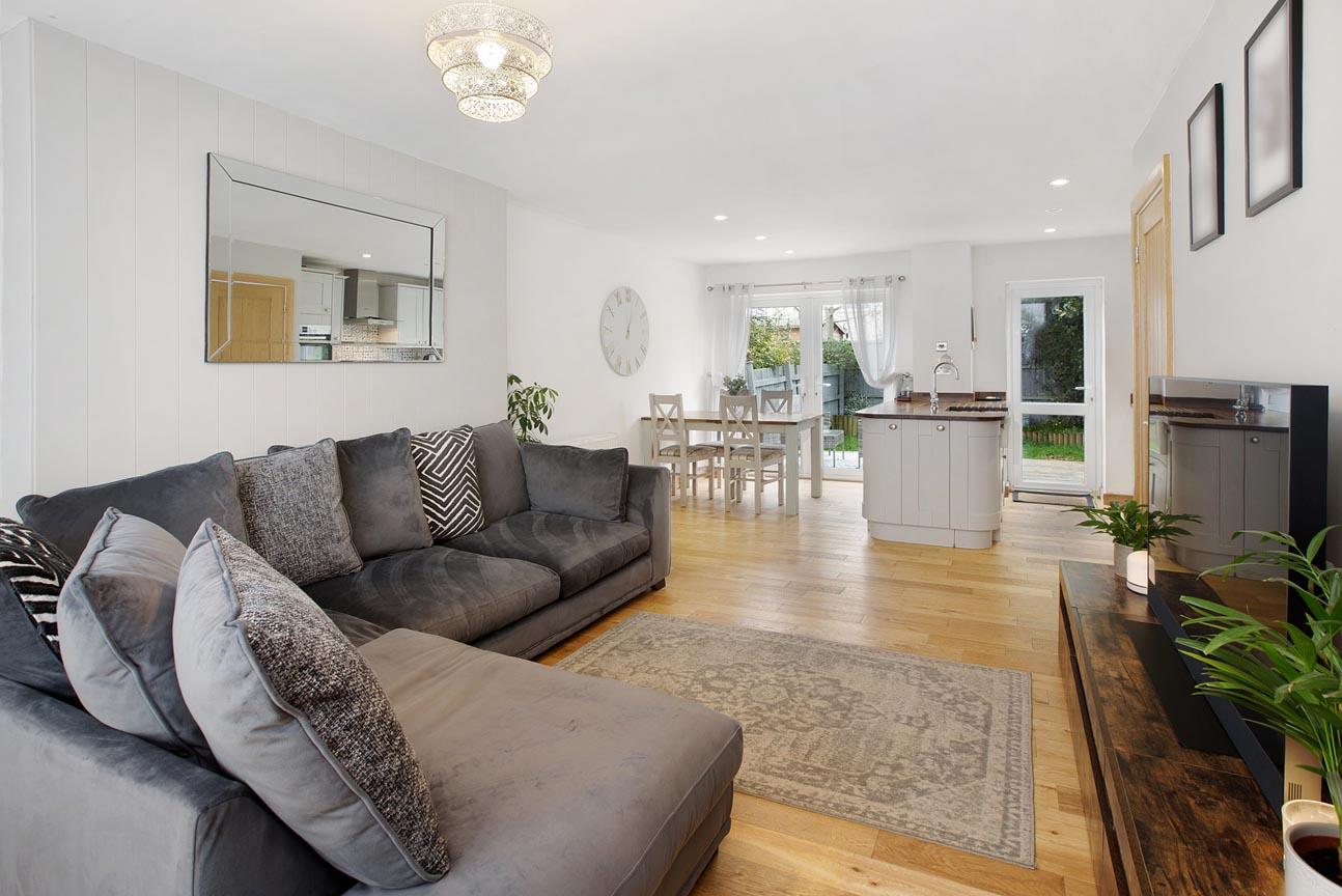OPEN PLAN KITCHEN/DINING/LIVING ROOM: uPVC double glazed window to the front, 2 radiators, under stairs storage cupboard, uPVC double glazed doors lead out to the decked area of the rear garden and a further uPVC double glazed door leading to the rear garden. A good quality fitted kitchen with shaker style base and eye level units, solid wood work tops over incorporating a Belfast style sink and drainer, induction hob, stainless steel extractor hood over, eye level double oven decorative tiled splash back, breakfast bar, spot lights and space for a good size table and chairs.