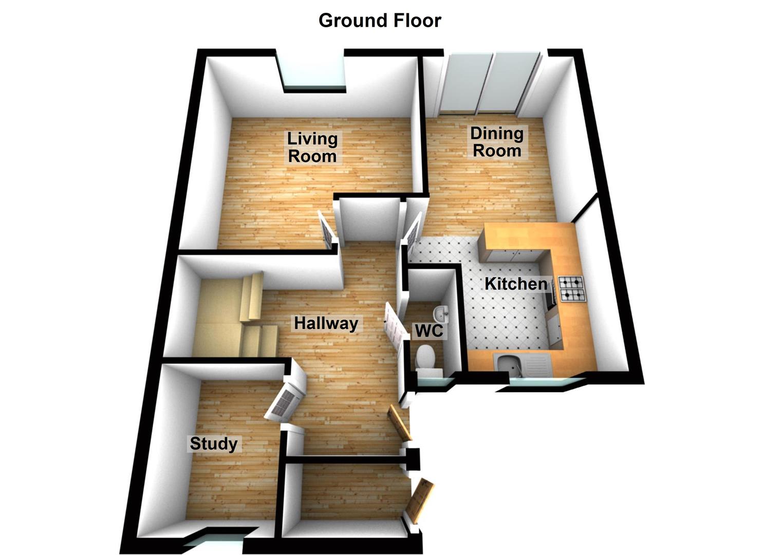 Entering the property, you find a hallway with stairs to the first floor and access to all downstairs rooms. There is a study room to the front of the property, a separate two-piece cloakroom ideal for families and visiting friends, a spacious living room, open kitchen diner with a fitted kitchen and patio door leading to the garden space. Upstairs, off the landing area is the boiler cupboard and store space, three bedrooms, two of which can accommodate a double bed, the third is a good sized single bedroom. Finally, there is a three piece bathroom with bath, separate shower and sink, there is then a separate cloakroom upstairs with a fitted WC.