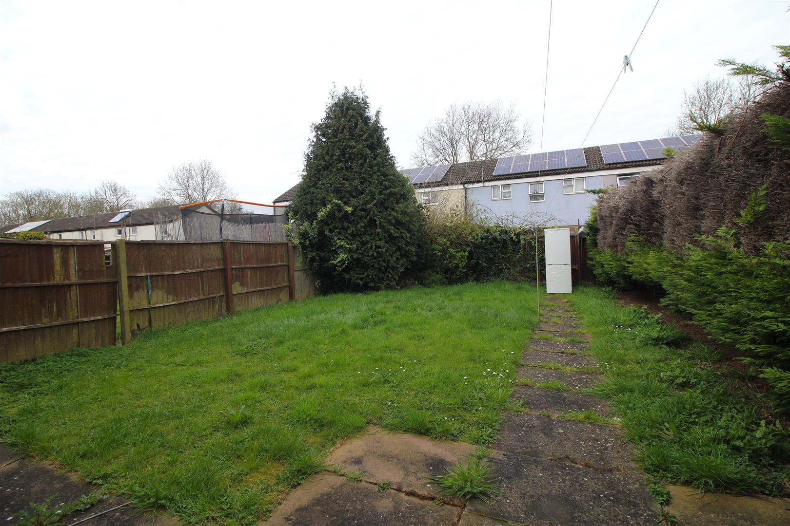 The property features an enclosed rear garden, mainly laid to lawn and enclosed by timber fencing. The front of the property has a meter cupboard with storage next to the front door.