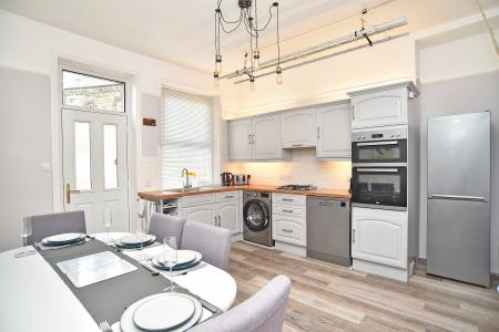 A smart and spacious kitchen/diner fitted with stylish Shaker-style units, eye-level double oven and grill, gas hob, wine storage and space for appliances. A door leads out to the rear patio garden.