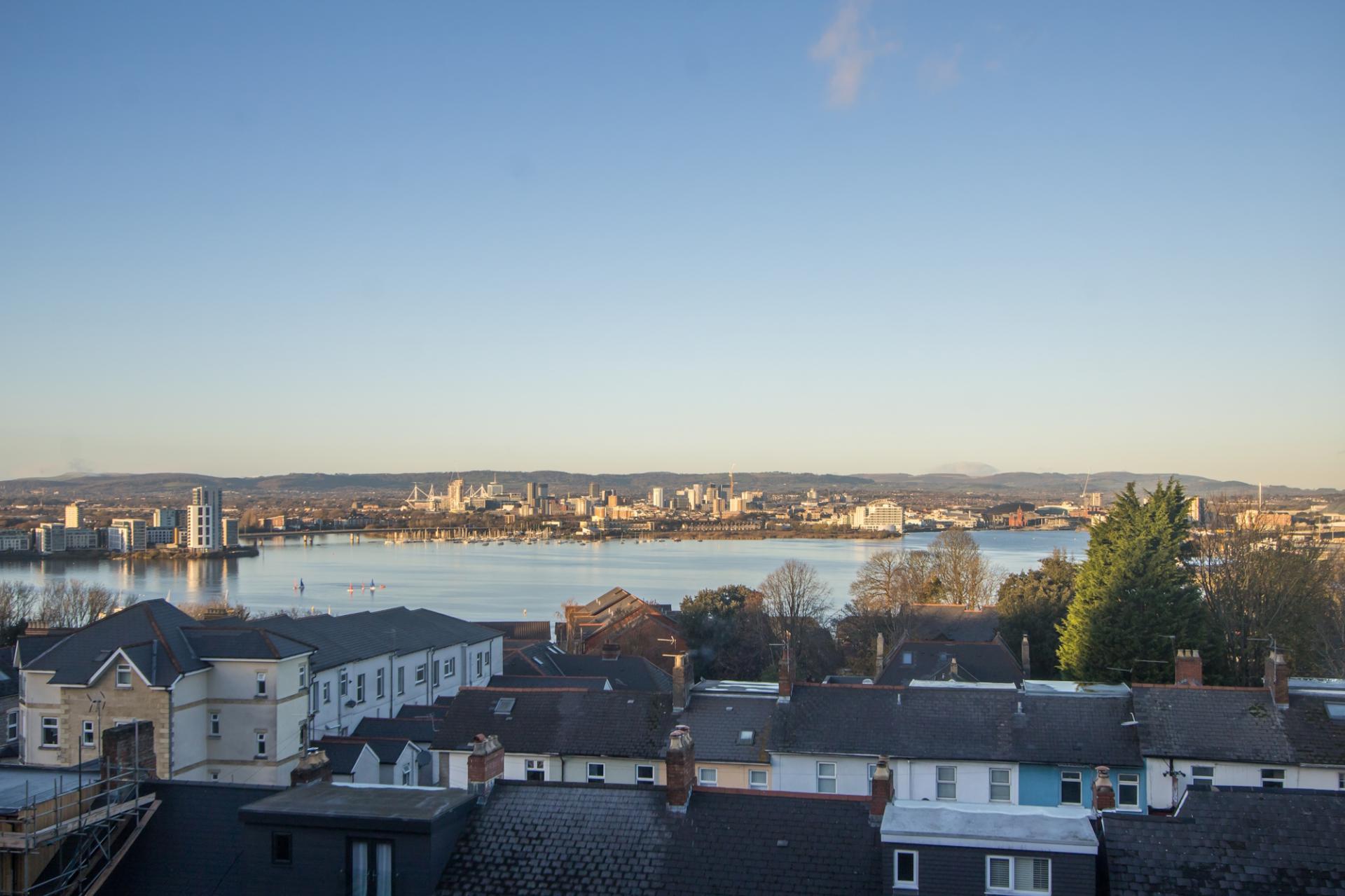 A kitchen with dining space and once again, outstanding views across Cardiff. Fitted wall units and base units with laminate work surfaces. Integrated appliances including an electric oven and four zone electric hob with extractor hood over. Plumbing for washing machine. Space for counter level fridge freezer. Single bowl stainless steel sink with drainer. uPVC double glazed window. Part tiled walls. Power points. Space for a dining table and chairs. Wall mounted electric heater.