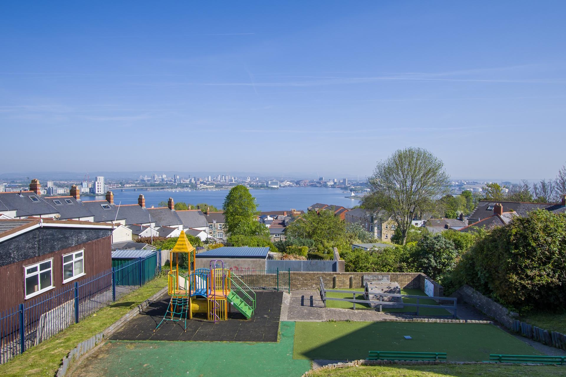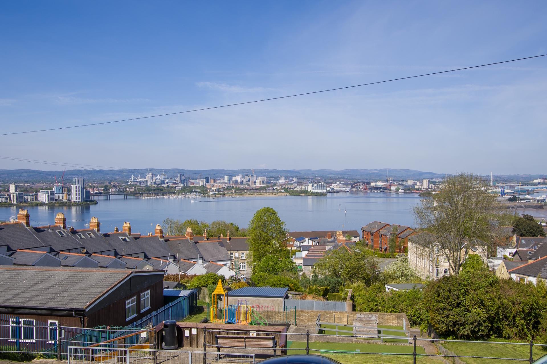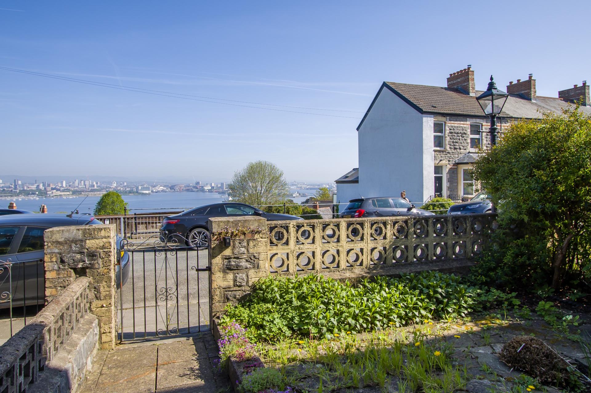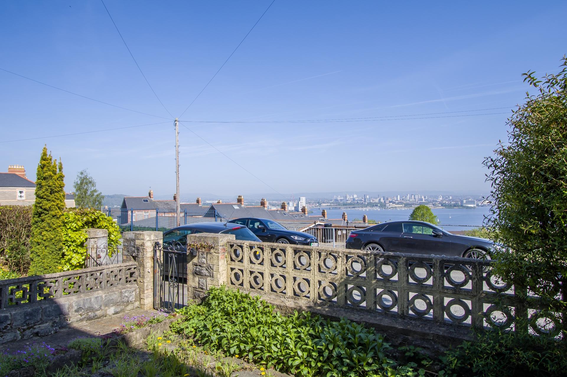 An enclosed front garden, laid to stone paving and with the original front wall and gate posts, gate and a pathway to the front door. You can enjoy the views over Cardiff from this area and there is space for seating.