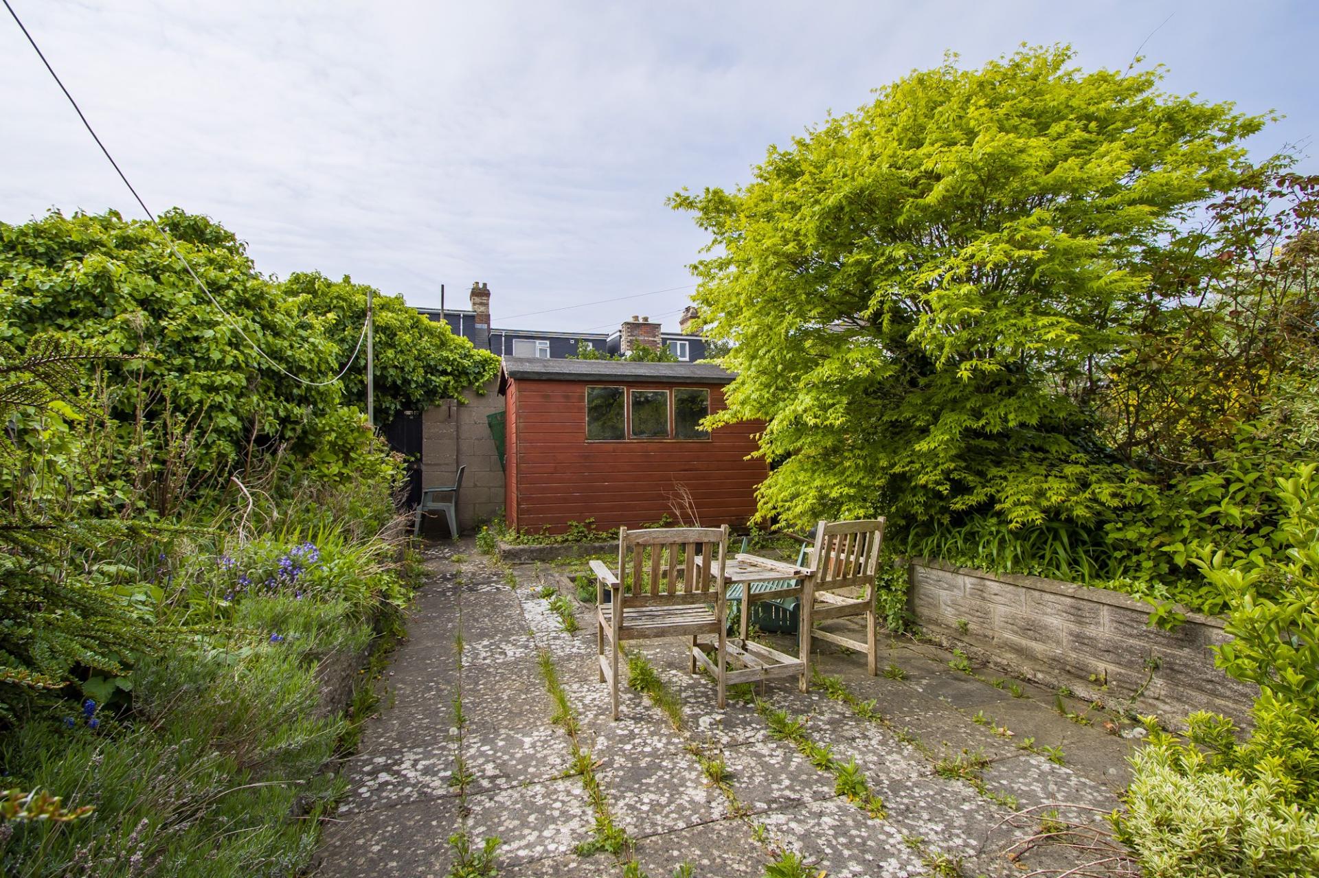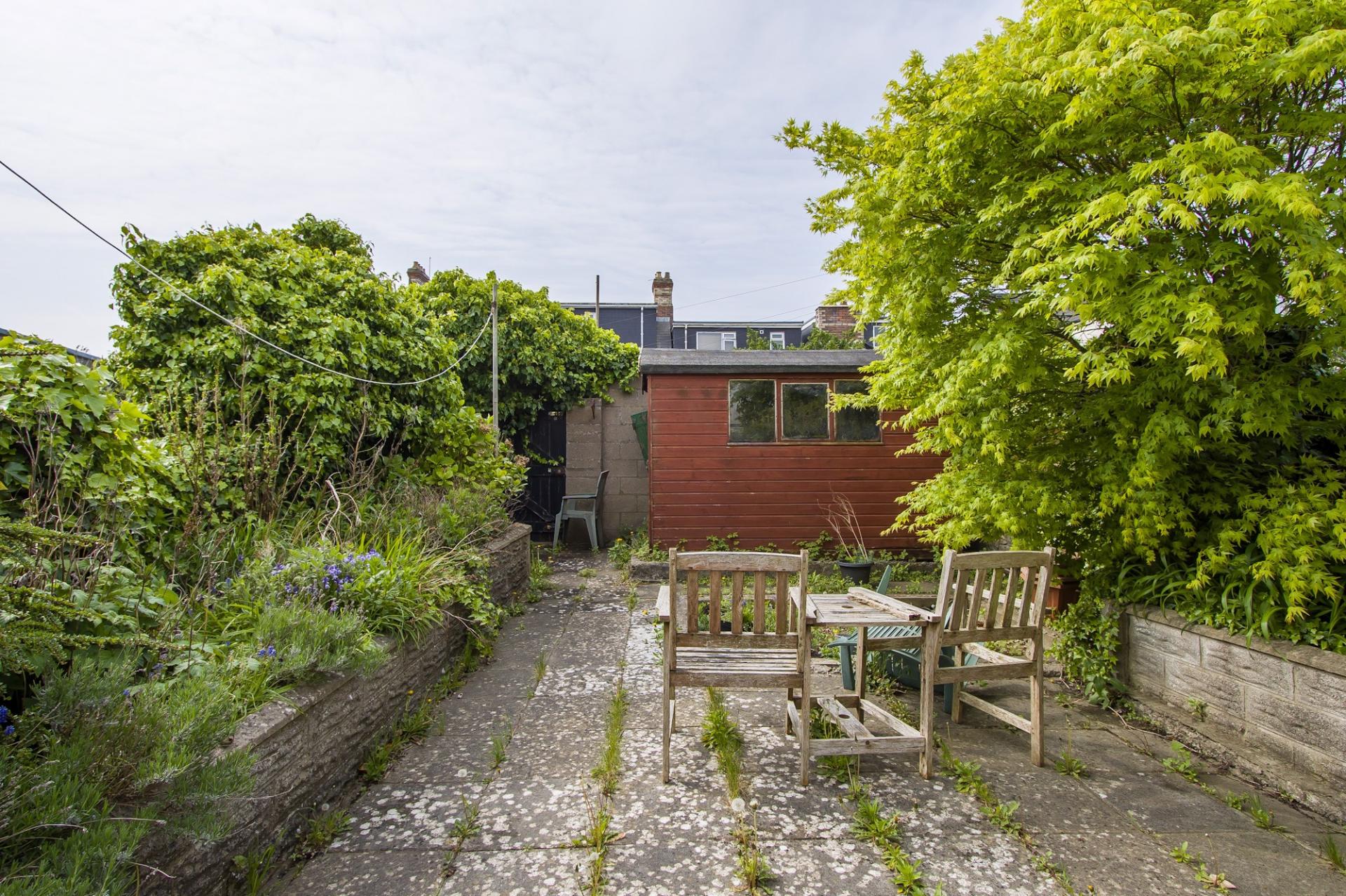 A south facing rear garden with areas of patio on two levels, both with room for furniture. Outside tap. Two timber sheds. Original stone walls. Raised planting bed to one side. Gated access to the lane. Outside WC.
