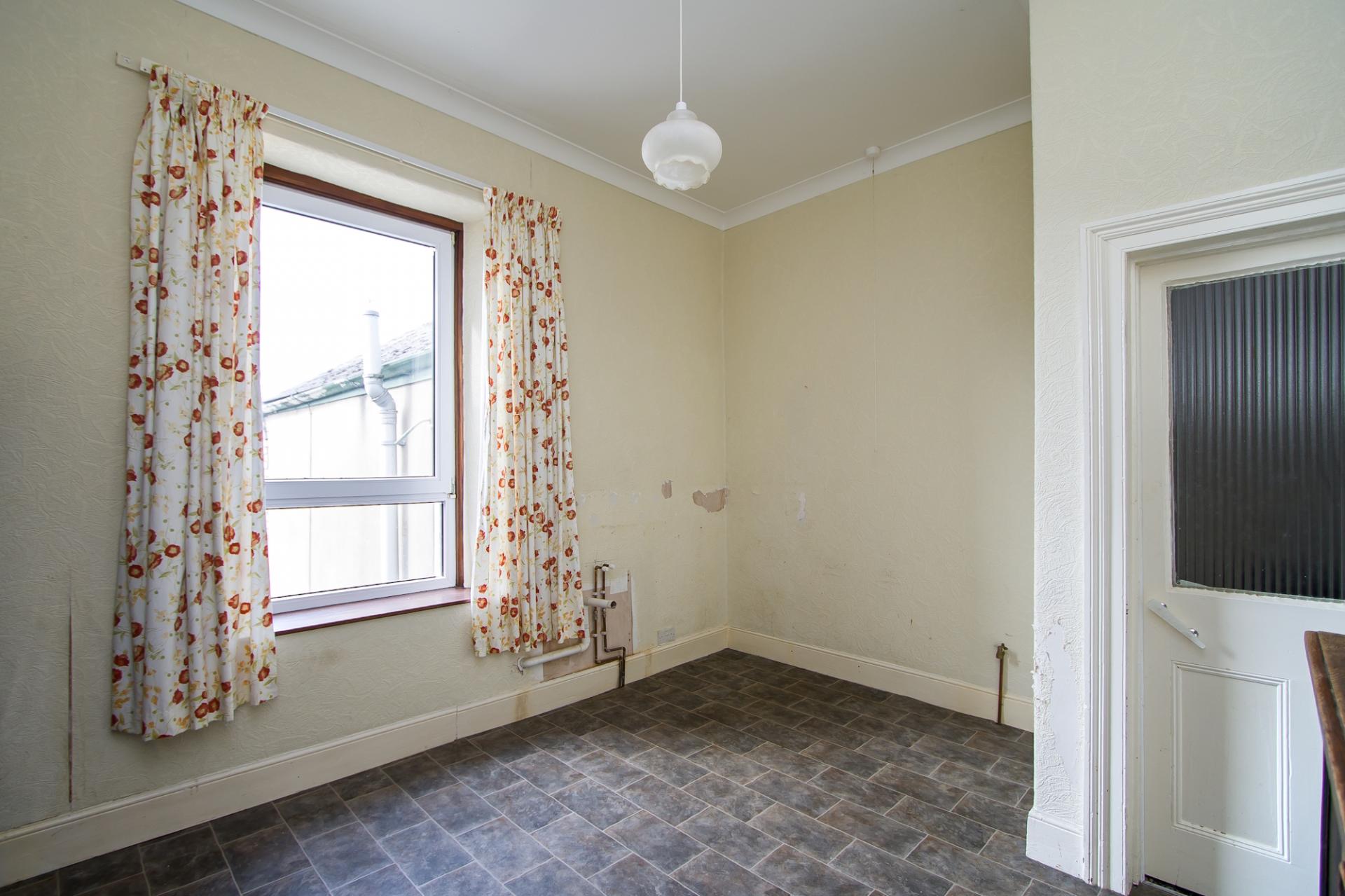 Vinyl flooring. uPVC double glazed windows to the side and rear along with a door to the side - all into the garden. Fitted kitchen comprising wall units and base units with laminate work surfaces. Single bowl stainless steel sink with drainer. Space for a cooker and fridge freezer. Central heating radiator. Part tiled walls. Power points.