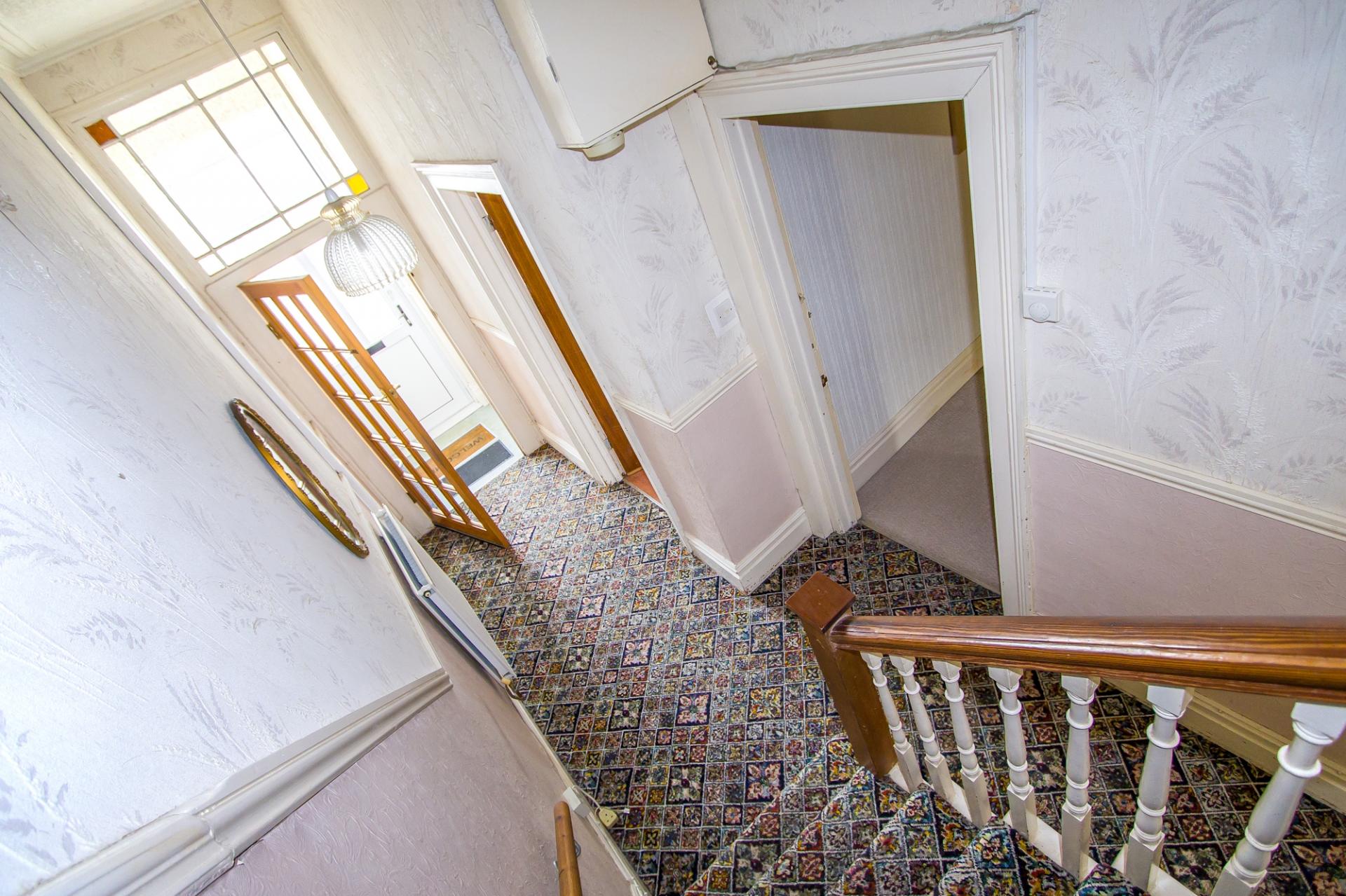 Fitted carpet to the stairs and landing. Phone point. High level cupboard and space for a freestanding cupboard. Doors to the three bedrooms and bathroom. Dado rails. Hatch to the loft space.