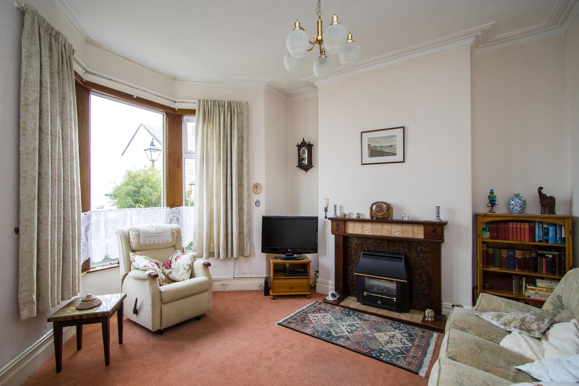 The main reception room, with uPVC double glazed bay window to the front that gives outstanding water views over Cardiff. Fitted carpet. Original cornice, rose and deep skirting boards. Fireplace with fitted gas fire. Central heating radiator. Power points and TV point.
