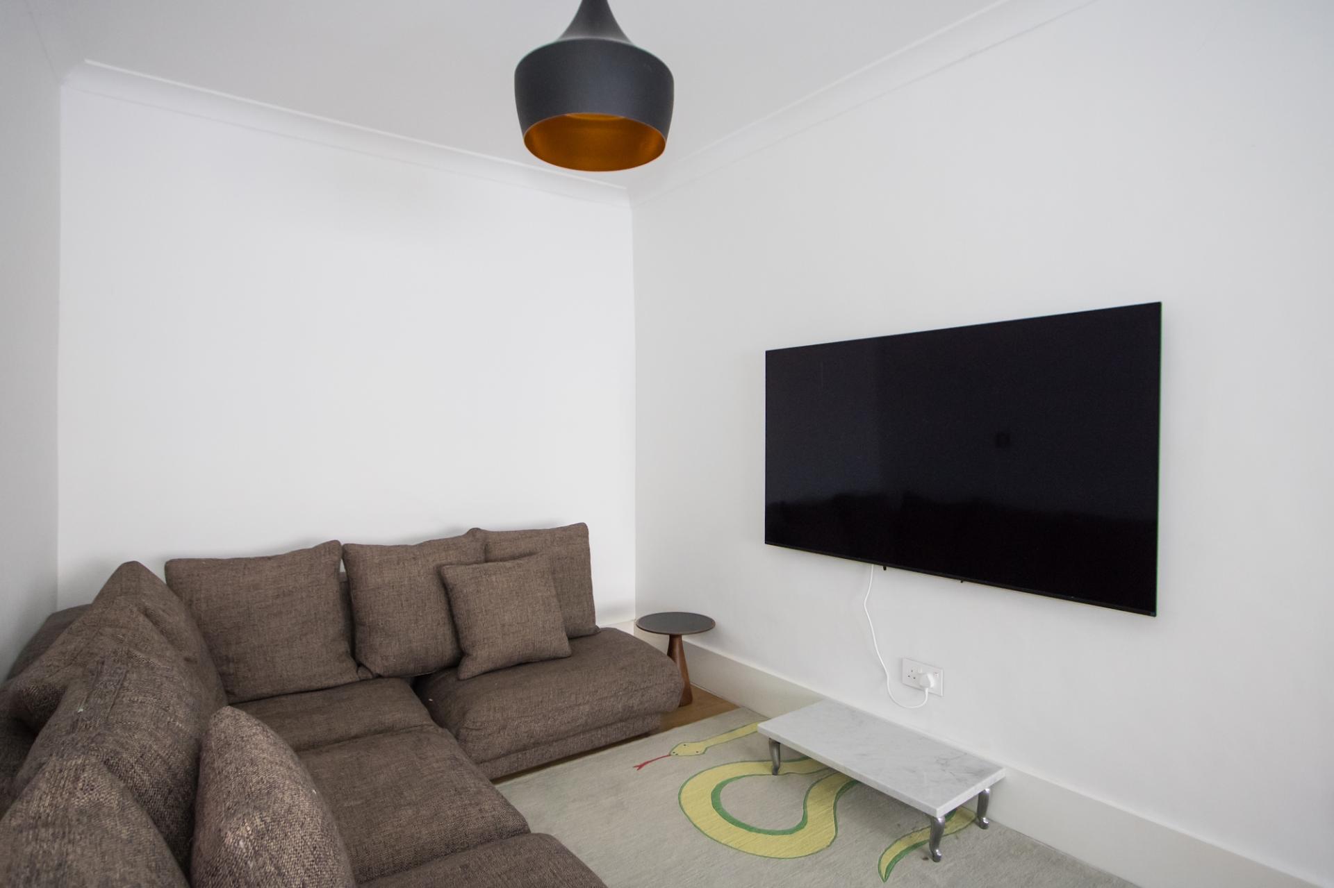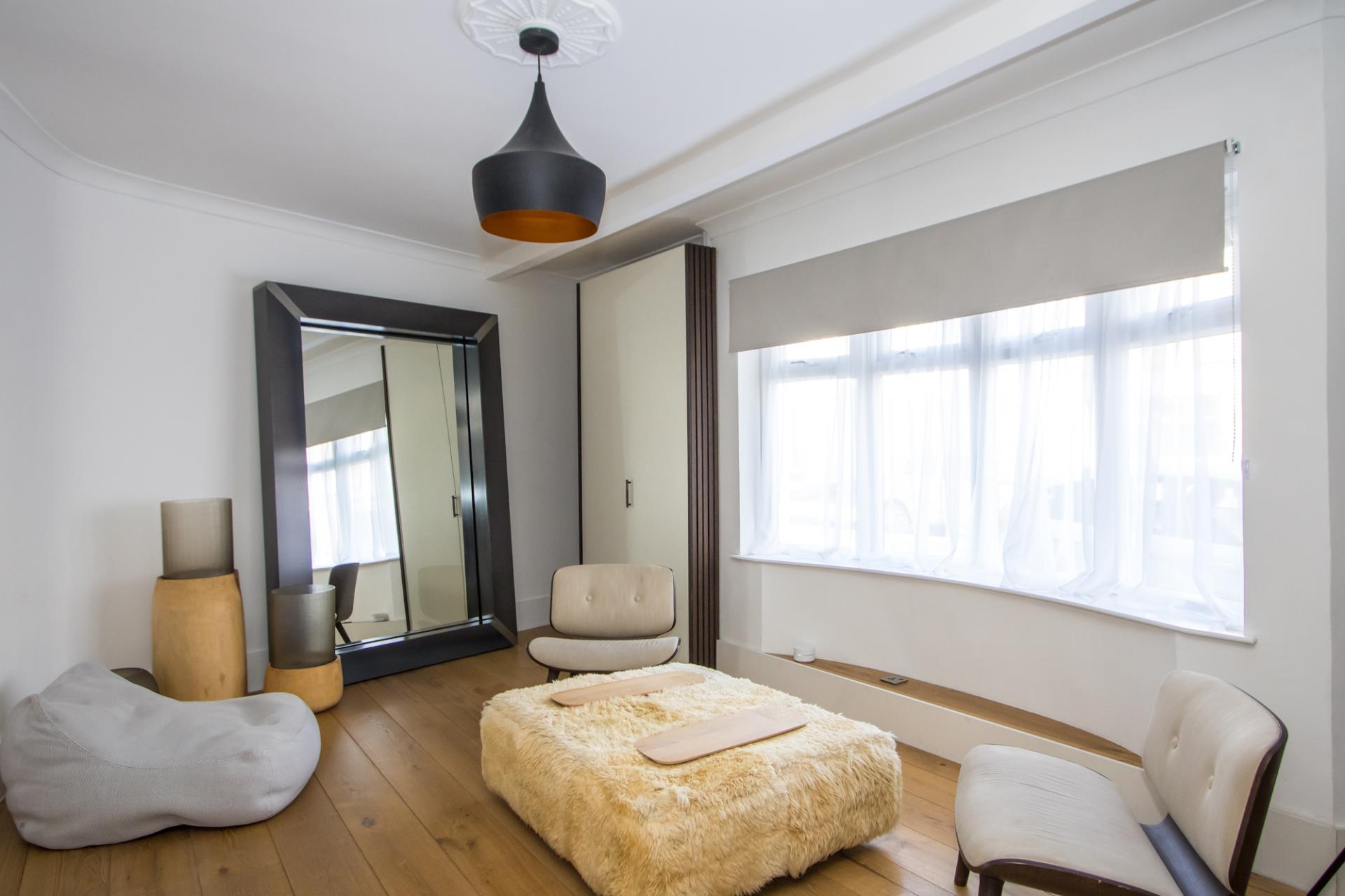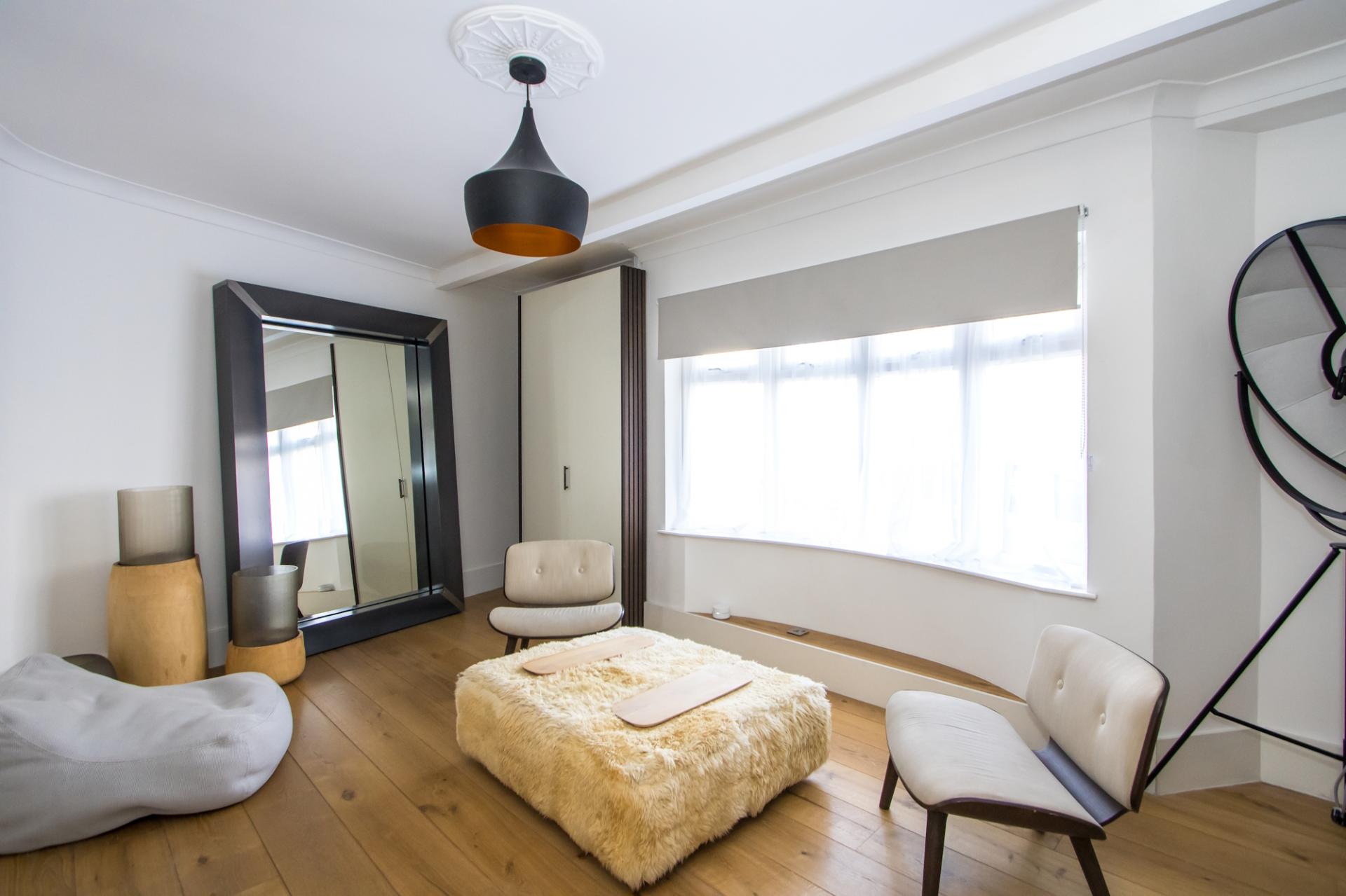 A L-shaped open plan space with two sitting areas. Engineered oak flooring throughout, with underfloor heating. uPVC double glazed bay window to the front. Coved ceiling. Power points and TV point. Built-in cupboard.