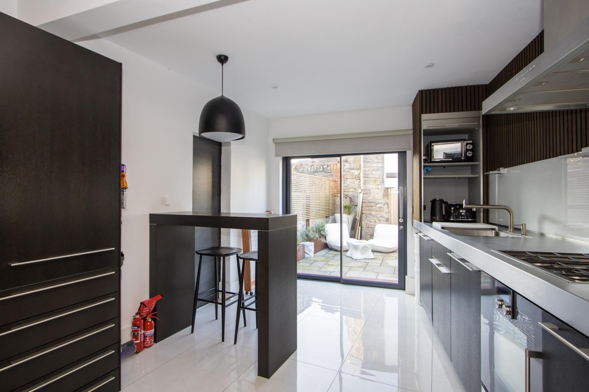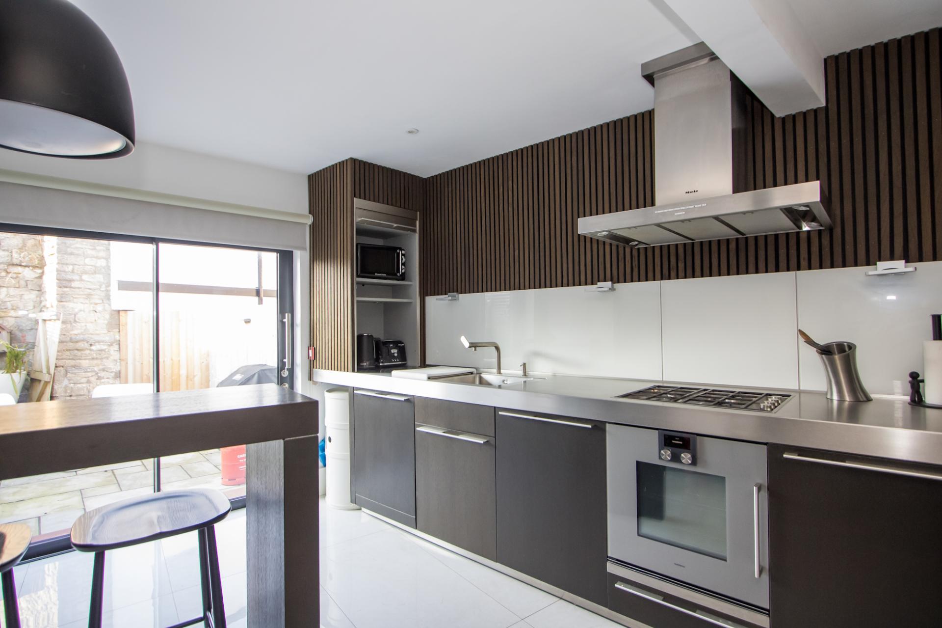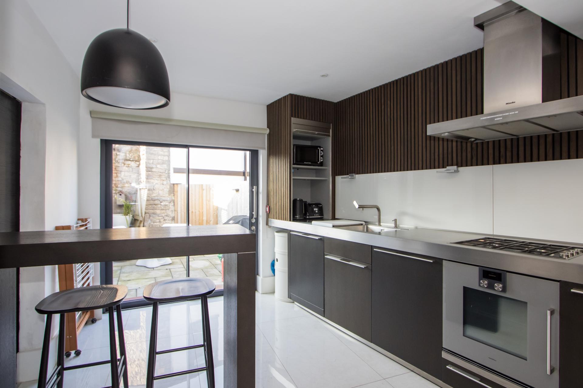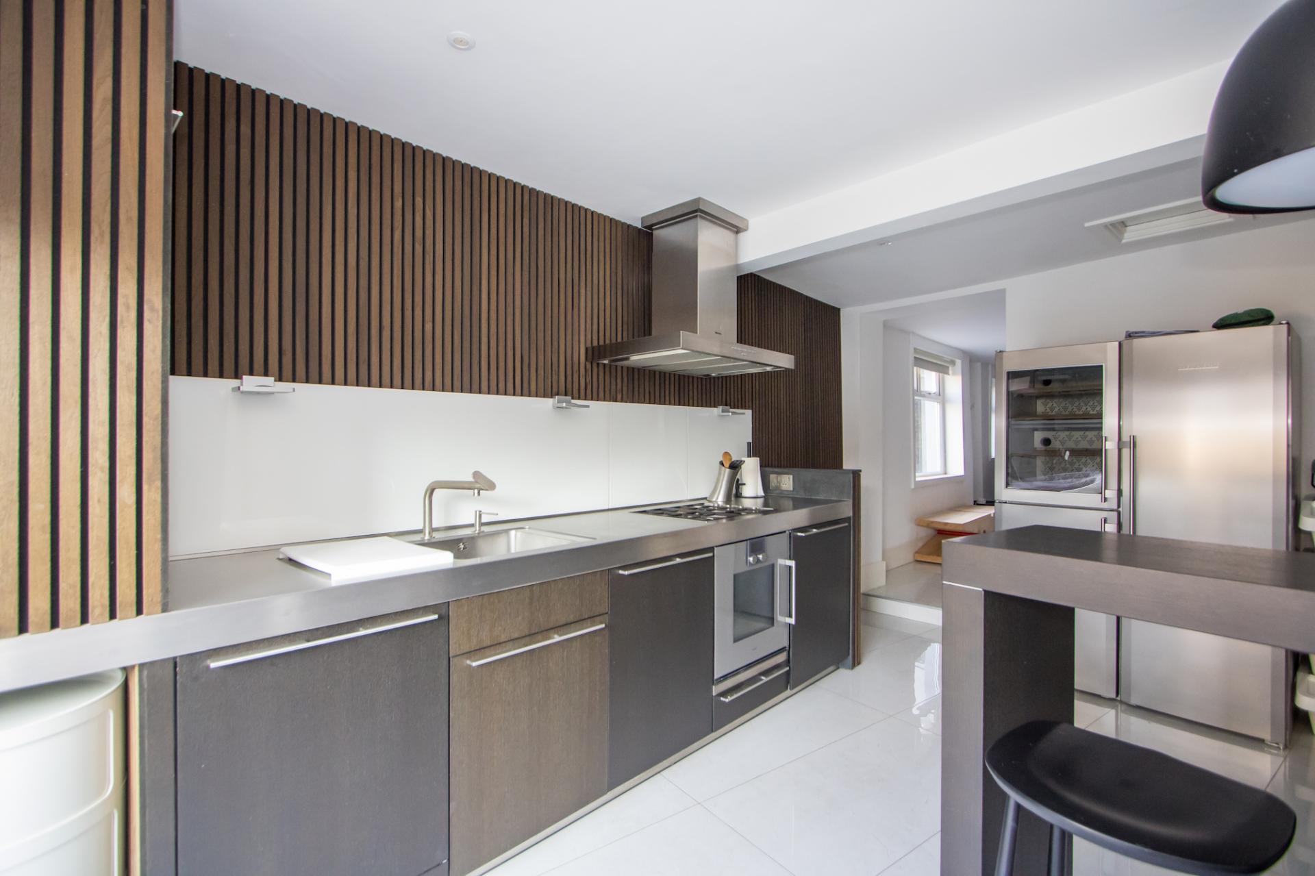 Tiled flooring continued from the dining room, with underfloor heating. German Bulthaup fitted kitchen with industrial style stainless steel work surfaces and breakfast bar. Integrated appliances including a Gaggenau oven, four burner Bapazza gas hob, Miele extractor hood, Liebherr pull out fridge and Gaggenau dishwasher. Space for an American style fridge freezer. Feature acoustic boarding and a built-in cupboard with Worcester Bosch gas combination boiler. Recessed lights. Aluminium double glazed sliding doors into the garden. Sliding door to the WC.