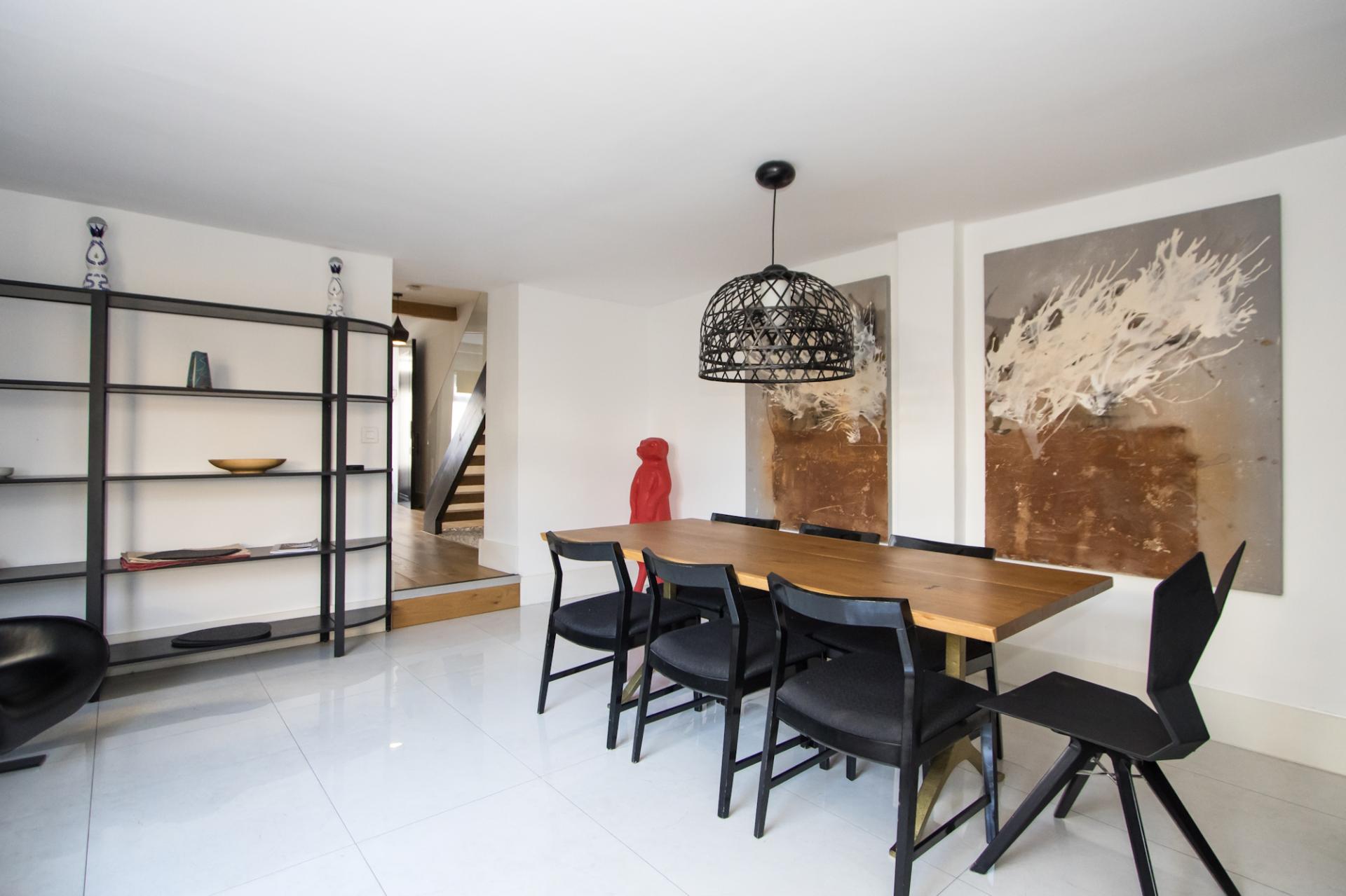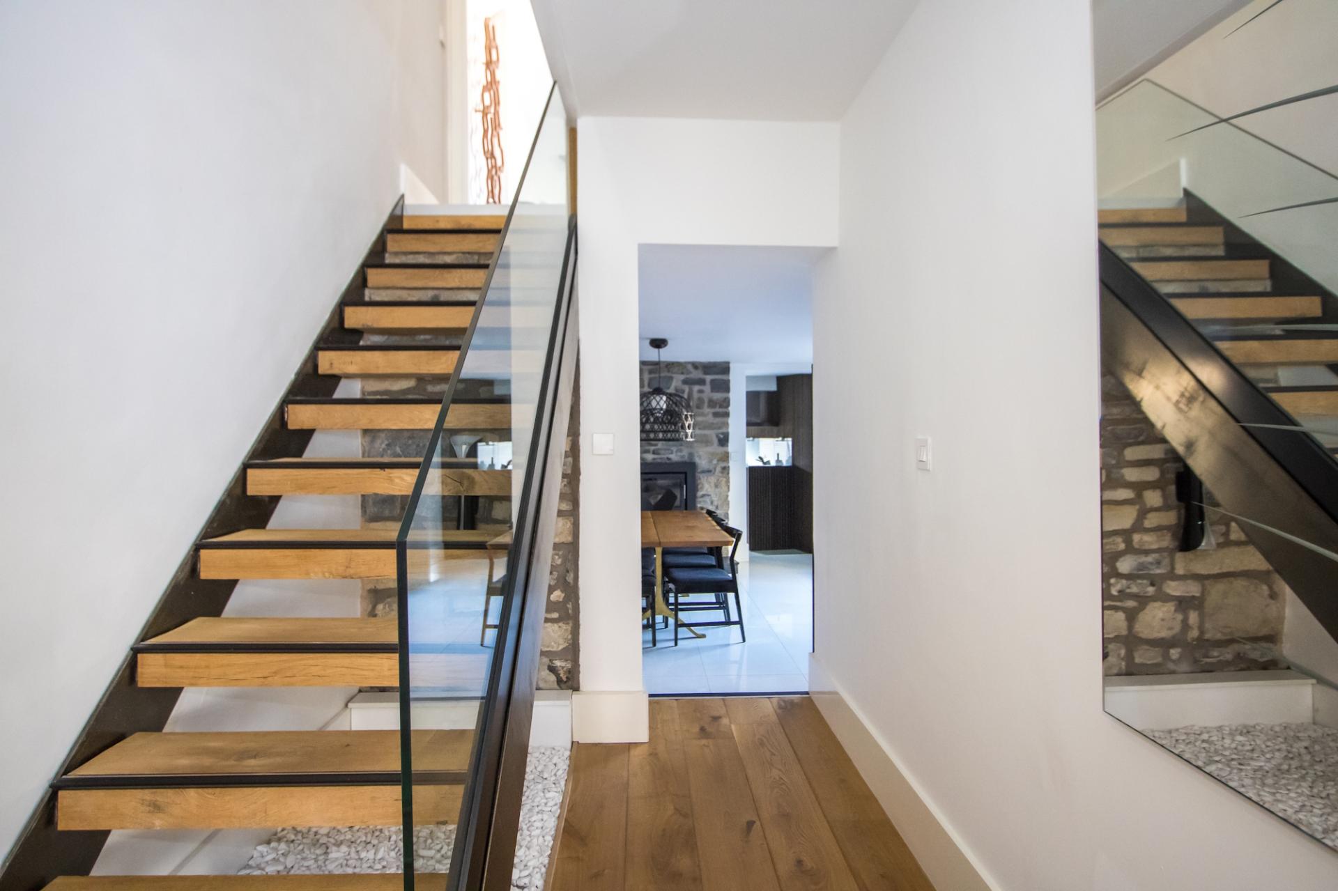 A highly impressive entrance hall, opening into the dining space and kitchen to the rear of the property and with high ceilings and a solid oak designer staircase, glass balustrade and with ornamental chippings and accent lighting beneath. Original brickwork feature wall. Engineered oak flooring with underfloor heating. Oversized custom doors to the living room.