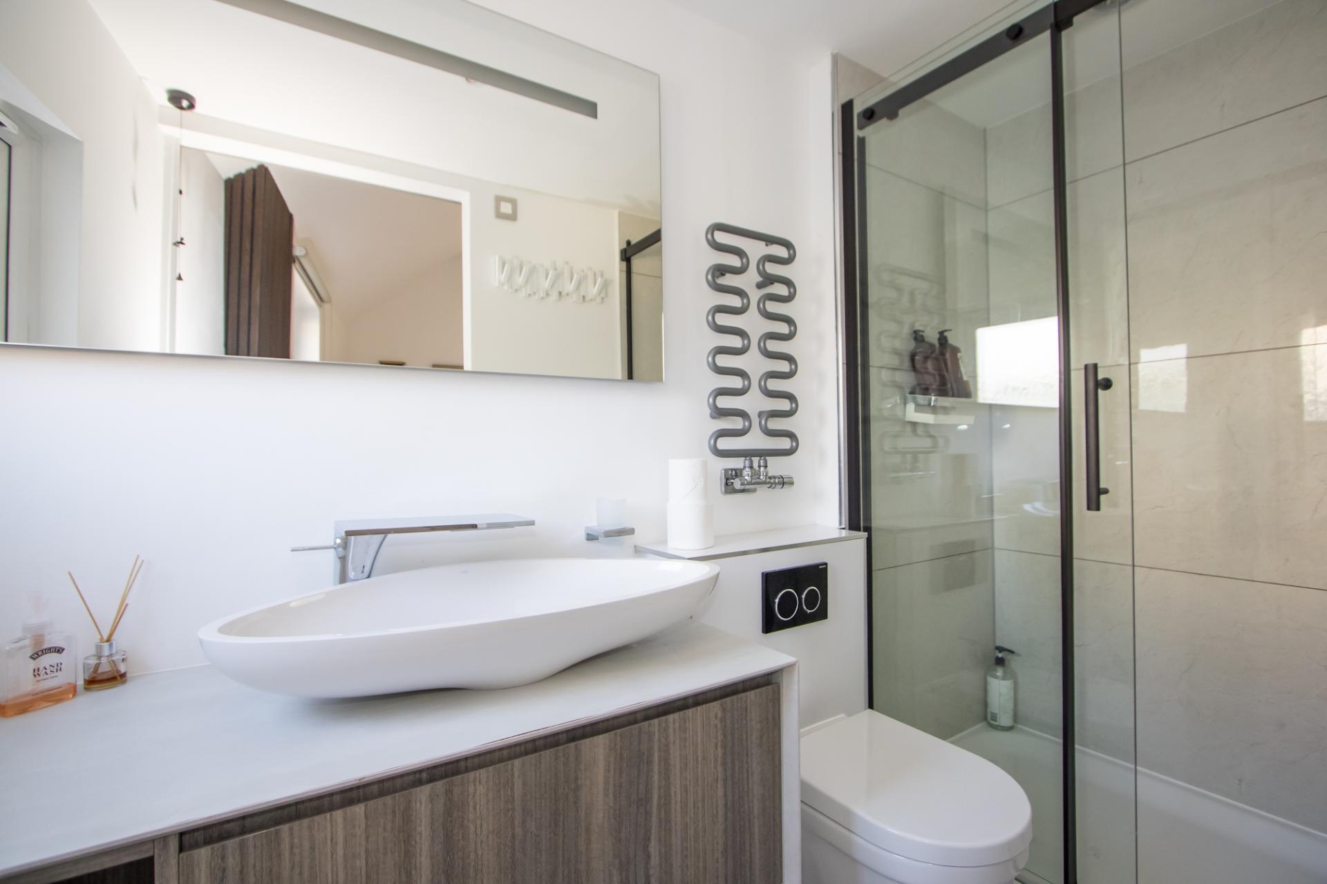 Tiled flooring and part tiled walls. Suite comprising a modern freestanding bath with mixer tap and hand shower fitment, a large walk-in shower with twin head mixer shower, WC and wash hand basin with storage below. Velux window. Heated towel rail. Fitted mirror with light. Recessed lights. Extractor fan.