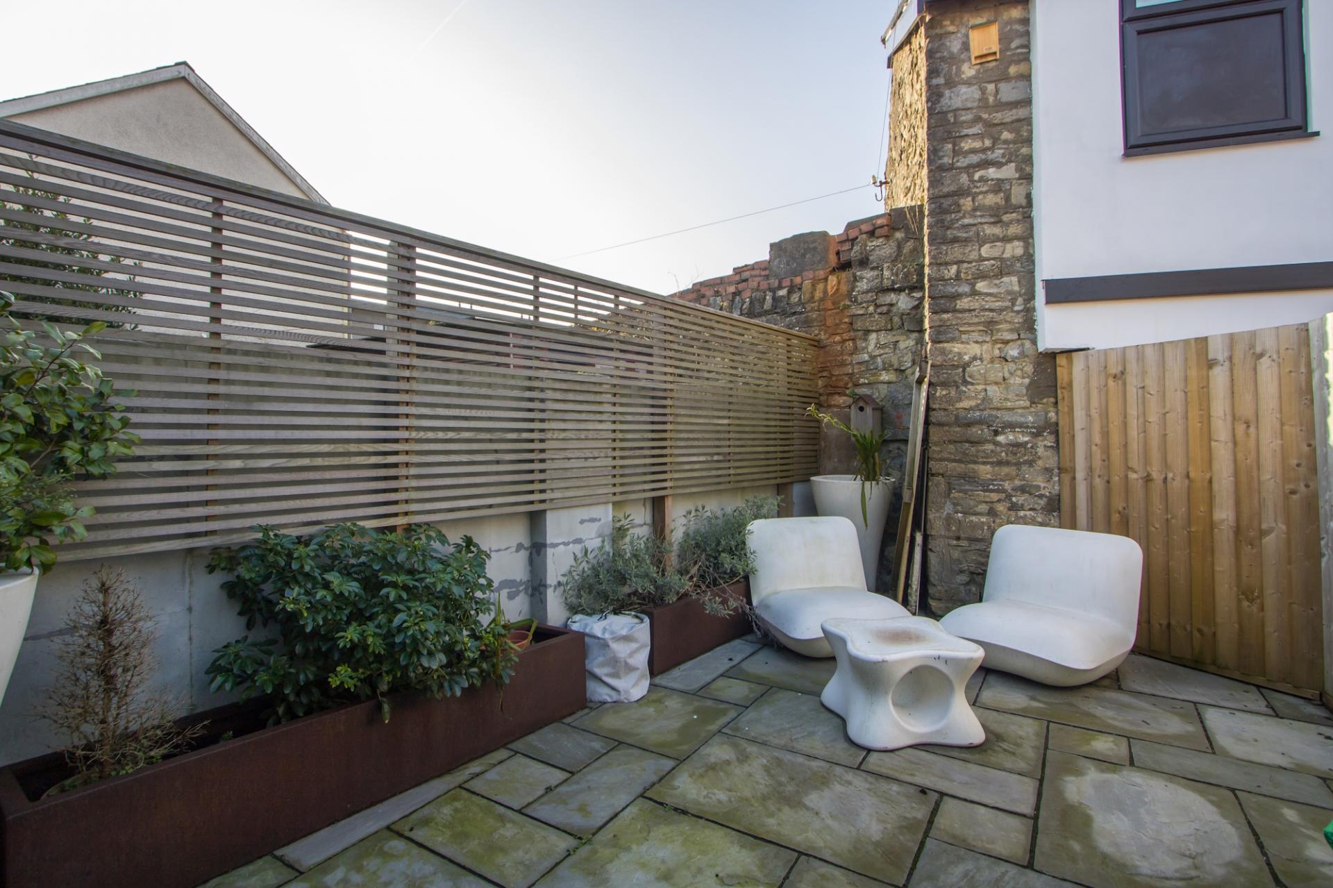 A courtyard style garden to the rear of the house with a westerly aspect. Steps from the kitchen with matching raised beds. Outside lights and tap.