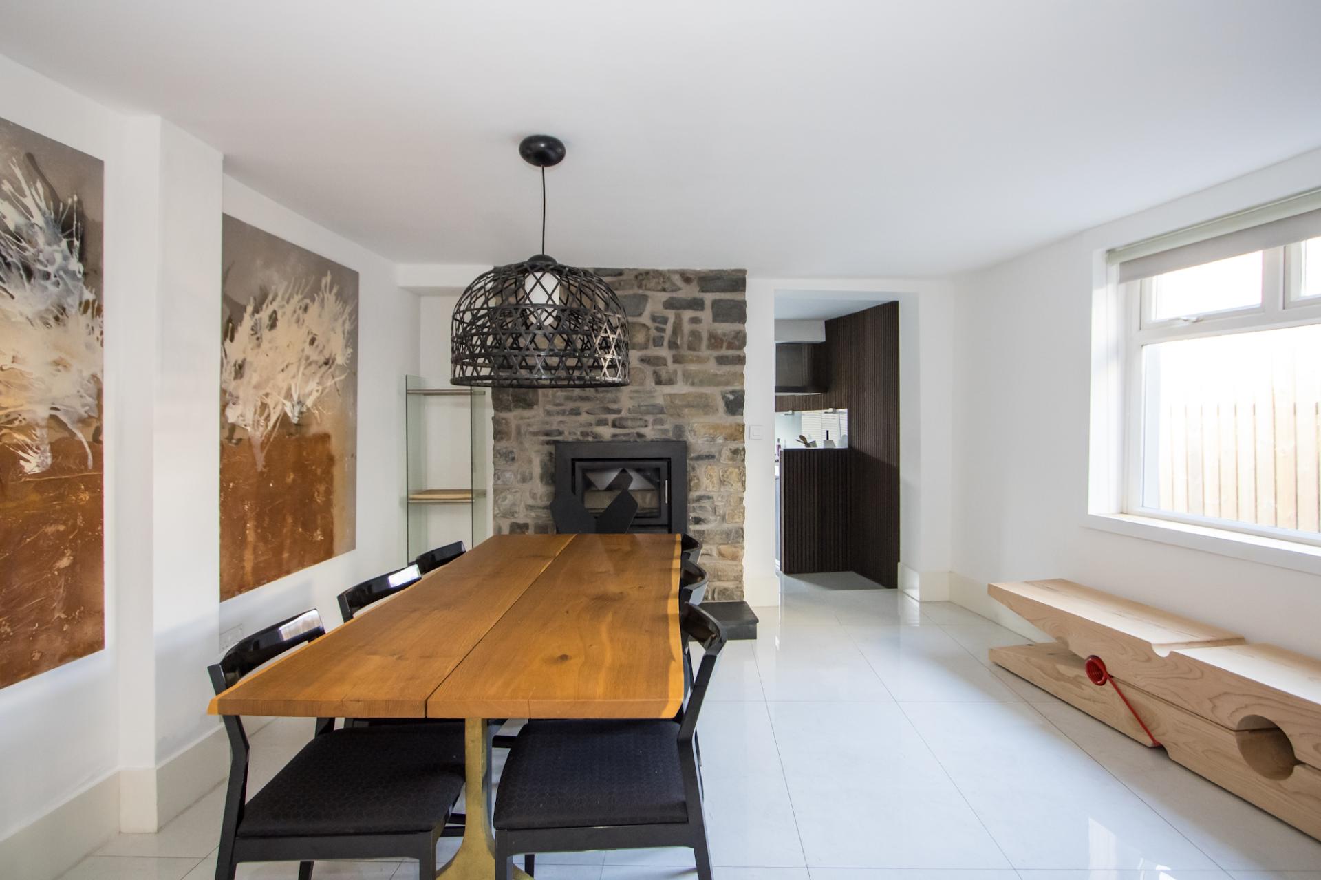 A very spacious second reception room, ideal for dining due to it leading into the kitchen. Tiled floor with underfloor heating. Two uPVC double glazed windows to the side. Feature original stone chimney breast with wood burning stove and slate hearth.