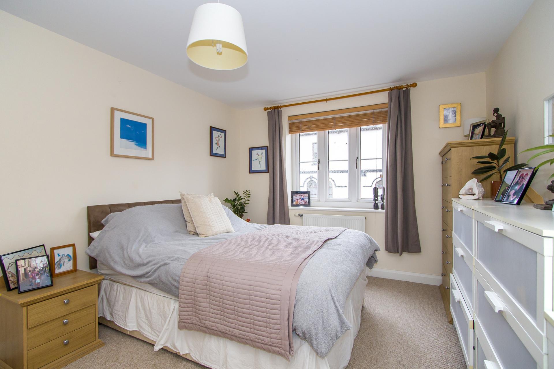 A double bedroom with uPVC double glazed windows to the front with fitted Venetian blinds. Fitted carpet. Central heating radiator. Power, TV and phone points. Recess ideal for wardrobes.
